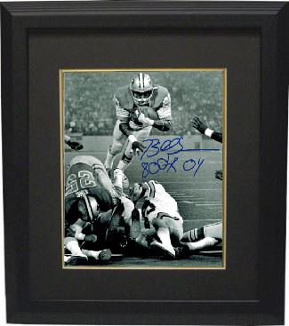 Billy Sims was the first overall pick in the 1980 NFL Draft. He spent five years with the Detroit Lions, making the Pro Bowl in 1980, 1981, and 1982. Sims led the Lions to the playoffs in 1982 and 1983 but they lost in the first round both times. Billy Sims has hand autographed this Detroit Lions 8x10 B&W Photo with 80 ROY inscription. Schwartz Sports Hologram and Certificate of Authenticity from Athlon Sports. Custom Black Mat and Premium Black Color Framed as shown