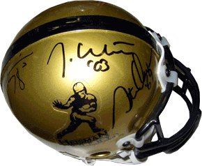 Steve Owens was the 1969 Heisman Trophy winner. Owens was the second Oklahoma Sooners player to win the Heisman Trophy, after Billy Vessels, and preceding Sam Bradford, Jason White and Billy Sims. He is the school's all time scorer with fifty-five touchdowns, and is third most on its career rushing chart with 4,041 yards. In 1978 Billy Sims was awarded the Heisman Trophy, becoming only the sixth junior to do so. He led the nation in rushing with 1,896 yards and had 22 touchdowns. He also became the first running back in Big 8 Conference history to rush for 200-yards in three consecutive games, and had four 200-yard games in a single season. Jason White won the Heisman Trophy at Oklahoma in 2003 after throwing 40 touchdown passes and 8 interceptions. White was also the recipient of the Associated Press Player of the Year, consensus All-American, consensus Big 12 Offensive Player of the Year, the Davey O'Brien Award and the Jim Thorpe Courage Award in his 2003 season. Steve Owens, Billy Sims, and Jason White has hand autographed this Riddell Authentic Gold Heisman mini helmet. Global Hologram and Certificate of Authenticity.
