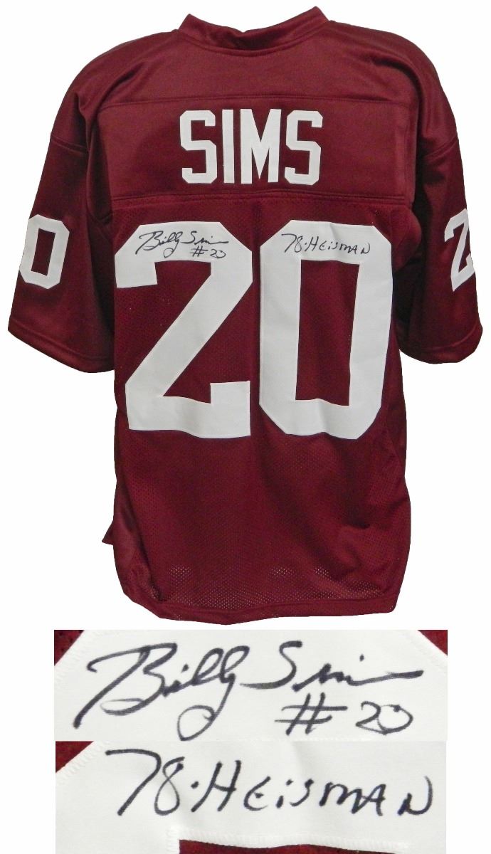 Billy Sims signed maroon custom football jersey with '78 Heisman' inscription. Item comes with a Schwartz Sports Memorabilia tamper-proof numbered hologram and Certificate of Authenticity which can be verified online.