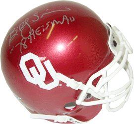 In his junior season Billy Sims cut loose, picking up 1,762 yards on 231 carries for an amazing average of 7.6 yards per carry for the regular season. Including the post-season Sims had 1,896 yards, a total yardage school record that stood until 2004 when freshman Adrian Peterson tallied up 1,925. In 1978 Sims was awarded the Heisman Trophy, becoming only the sixth junior to do so. He led the nation in rushing with 1,896 yards and had 22 touchdowns. He also became the first running back in Big 8 Conference history to rush for 200-yards in three consecutive games, and had four 200-yard games in a single season. Billy Sims has hand autographed this Oklahoma Sooners Schutt Authentic mini helmet with 78 Heisman Inscription. Certificate of Authenticity from Athlon Sports.