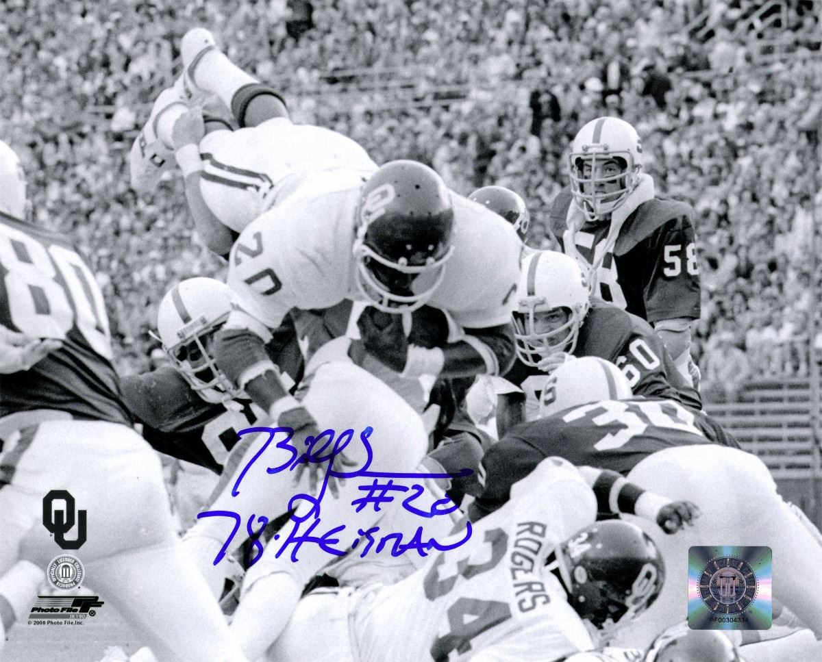 Billy Sims signed Oklahoma Sooners black and white goal line leap action 8x10 photo with '78 Heisman' inscription. Item comes with a Schwartz Sports Memorabilia tamper-proof numbered hologram and Certificate of Authenticity which can be verified online.