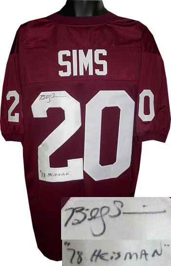 In his junior season Billy Sims cut loose, picking up 1,762 yards on 231 carries for an amazing average of 7.6 yards per carry for the regular season. Including the post-season Sims had 1,896 yards, a total yardage school record that stood until 2004 when freshman Adrian Peterson tallied up 1,925. In 1978 Sims was awarded the Heisman Trophy, becoming only the sixth junior to do so. He led the nation in rushing with 1,896 yards and had 22 touchdowns. He also became the first running back in Big 8 Conference history to rush for 200-yards in three consecutive games, and had four 200-yard games in a single season. Billy Sims Oklahoma Sooners signed Maroon unlicensed custom-prostyle jersey with twill stitched nameplate and numbers with 78 Heisman inscription. Size XL. Certificate of Authenticity from Athlon Sports.