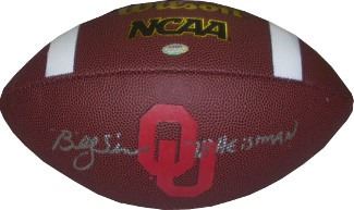 In his junior season Billy Sims cut loose, picking up 1,762 yards on 231 carries for an amazing average of 7.6 yards per carry for the regular season. Including the post-season Sims had 1,896 yards, a total yardage school record that stood until 2004 when freshman Adrian Peterson tallied up 1,925. In 1978 Sims was awarded the Heisman Trophy, becoming only the sixth junior to do so. He led the nation in rushing with 1,896 yards and had 22 touchdowns. He also became the first running back in Big 8 Conference history to rush for 200-yards in three consecutive games, and had four 200-yard games in a single season. Billy Sims has hand autographed this Oklahoma Sooners NCAA Brown Logo Football with 78 Heisman inscription. Schwartz Sports Hologram and Certificate of Authenticity from Athlon Sports.