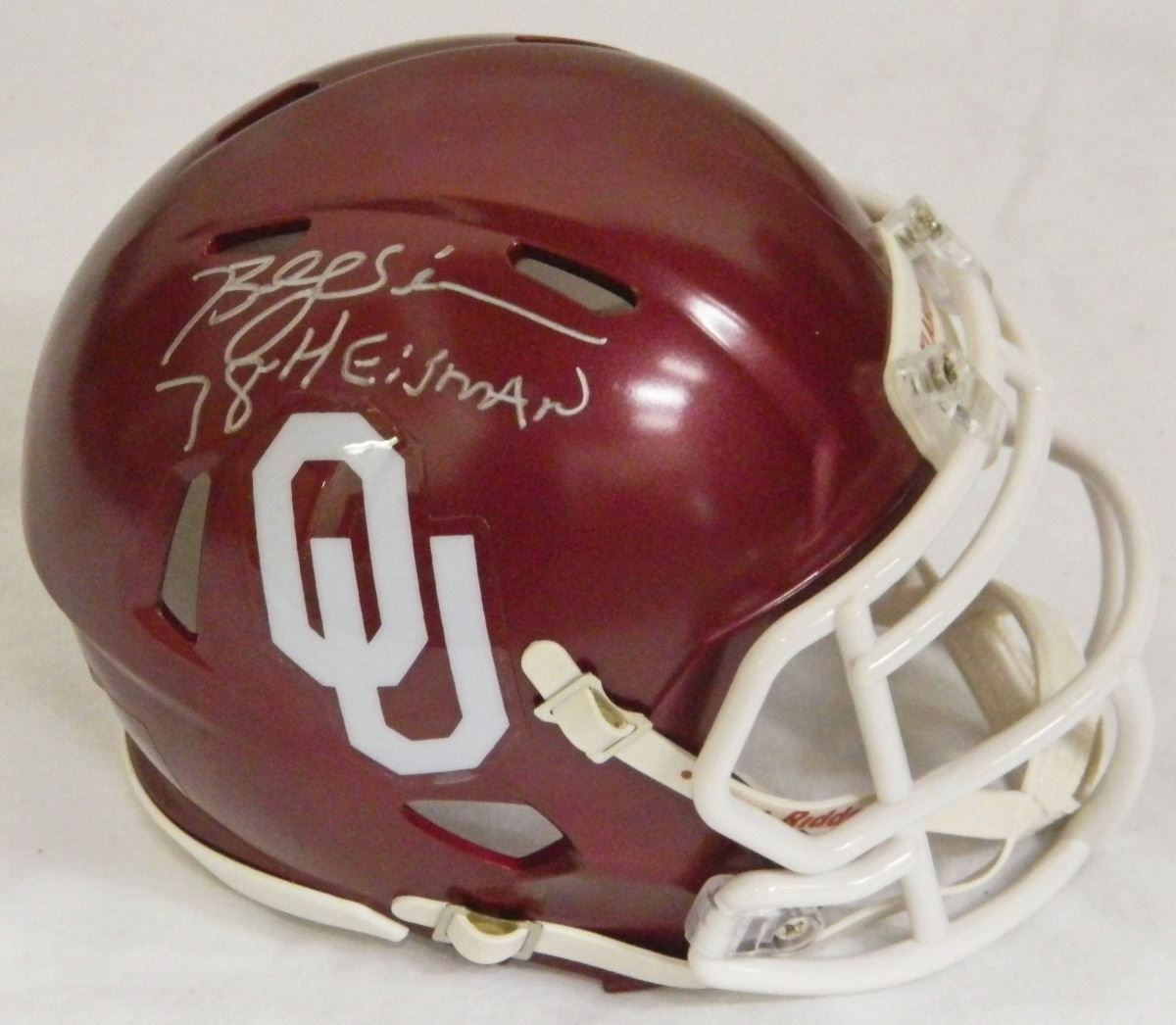 Billy Sims signed Oklahoma Sooners Ridell mini helmet with '78 Heisman' inscription. Item comes with a Schwartz Sports Memorabilia tamper-proof numbered hologram and Certificate of Authenticity which can be verified online.