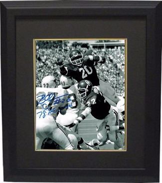 In his junior season Billy Sims cut loose, picking up 1,762 yards on 231 carries for an amazing average of 7.6 yards per carry for the regular season. Including the post-season Sims had 1,896 yards, a total yardage school record that stood until 2004 when freshman Adrian Peterson tallied up 1,925. In 1978 Sims was awarded the Heisman Trophy, becoming only the sixth junior to do so. He led the nation in rushing with 1,896 yards and had 22 touchdowns. He also became the first running back in Big 8 Conference history to rush for 200-yards in three consecutive games, and had four 200-yard games in a single season. Billy Sims has hand autographed this Oklahoma Sooners 16x20 Vintage B&W Photo with 78 Heisman inscription. Schwartz Sports Hologram and Certificate of Authenticity from Athlon Sports. Custom Black Mat and Premium Black Color Framed as shown