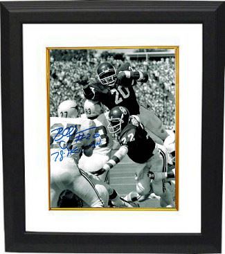 In his junior season Billy Sims cut loose, picking up 1,762 yards on 231 carries for an amazing average of 7.6 yards per carry for the regular season. Including the post-season Sims had 1,896 yards, a total yardage school record that stood until 2004 when freshman Adrian Peterson tallied up 1,925. In 1978 Sims was awarded the Heisman Trophy, becoming only the sixth junior to do so. He led the nation in rushing with 1,896 yards and had 22 touchdowns. He also became the first running back in Big 8 Conference history to rush for 200-yards in three consecutive games, and had four 200-yard games in a single season. Billy Sims has hand autographed this Oklahoma Sooners 16x20 Vintage B&W Photo with 78 Heisman inscription. Schwartz Sports Hologram and Certificate of Authenticity from Athlon Sports. Custom White Mat and Premium Black Color Framed as shown