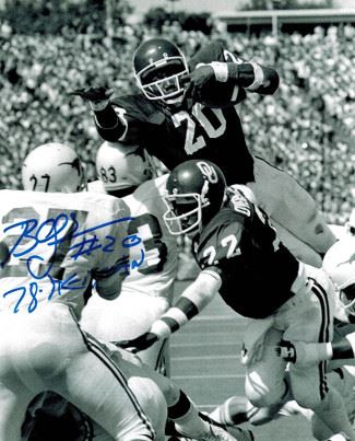 In his junior season Billy Sims cut loose, picking up 1,762 yards on 231 carries for an amazing average of 7.6 yards per carry for the regular season. Including the post-season Sims had 1,896 yards, a total yardage school record that stood until 2004 when freshman Adrian Peterson tallied up 1,925. In 1978 Sims was awarded the Heisman Trophy, becoming only the sixth junior to do so. He led the nation in rushing with 1,896 yards and had 22 touchdowns. He also became the first running back in Big 8 Conference history to rush for 200-yards in three consecutive games, and had four 200-yard games in a single season. Billy Sims has hand autographed this Oklahoma Sooners 8x10 Vintage B&W Photo with 78 Heisman inscription. Schwartz Sports Hologram and Certificate of Authenticity from Athlon Sports.