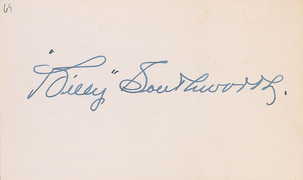 Baseball Hall of Famer (1893–1969). Vintage ink signature, “‘Billy’ Southworth,” on an off-white 5 x 3 card. In fine condition.