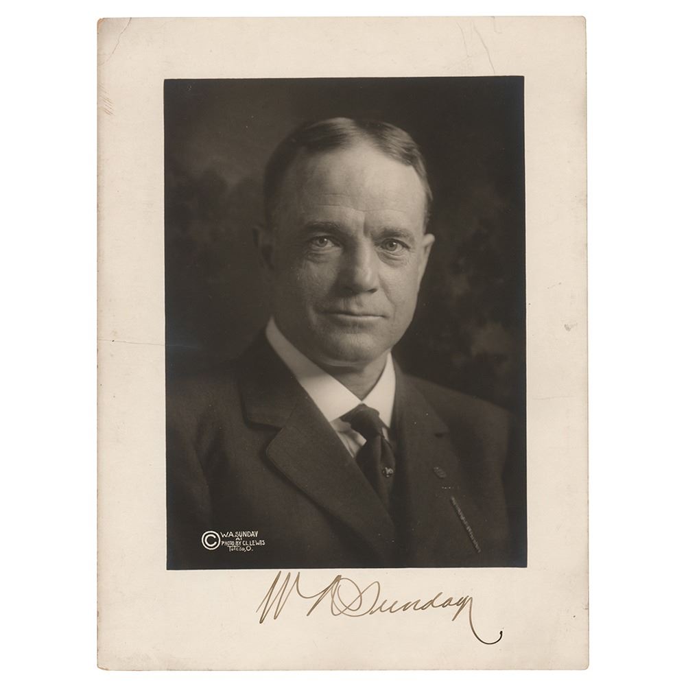 Vintage matte-finish 7.5 x 10 photo of Sunday by C. L. Lewis of Toledo, Ohio, signed in the lower border in fountain pen, "W. A. Sunday." In very good to fine condition, with a few creases to the border, and a bit of silvering to the image.