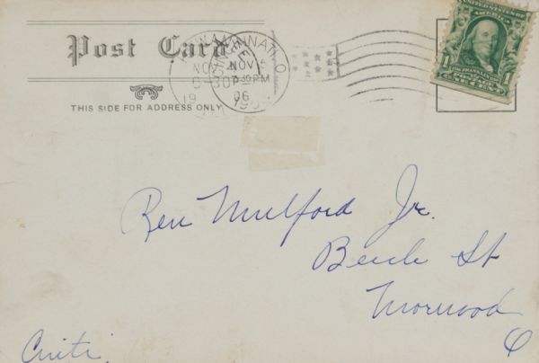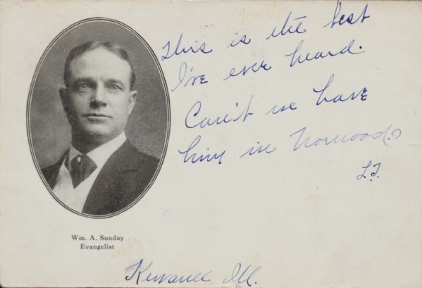 Evangelist, and former baseball player, who preached a fundamentalist theology in a highly flamboyant style. TLS signed “Wm. Sunday,” one page, 8.5 x 11, The Newport News Evangelistic Campaign letterhead, dated Oct, 14,1910. Letter written to Ren Mulford, who is a famous early baseball reporter starting in 1888 with Sporting World and credited for coining the term" Fan". Letter from Sunday is about visiting with Mulford when he is visiting Cincinnati and in part : “ he should attend our services…..and you advertising fellows are usually running on such high tension that you need to slow up” Also accompanied with a early photo portrait postcard of Sunday to Mulford, form someone with initials L.J.