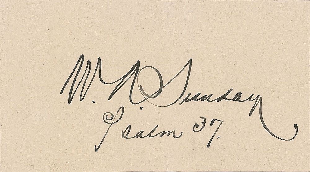 Evangelist (1862–1935) and former baseball player who preached a fundamentalist theology in a highly flamboyant style. Vintage ink signature, “W. A. Sunday, Psalm 37,” on an off-white 5 x 3 card. In very good condition, with a central vertical crease and