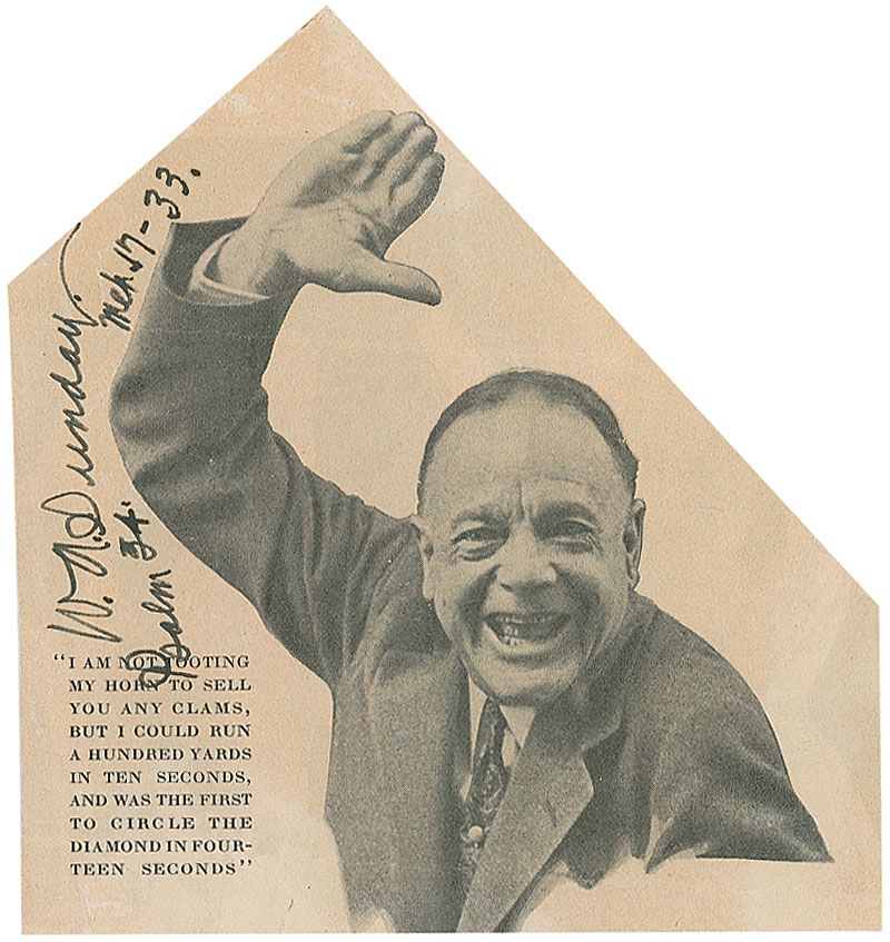 Vintage irregularly clipped 5 x 5 magazine photo of Sunday preaching, signed in fountain pen, “W. A. Sunday, Mch 17-33, Psalm 34.” Photo is affixed to an identically sized clipped scrapbook page. A few light creases and aforementioned irregularly trimmed edges, otherwise fine condition.