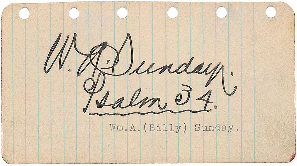 Vintage ink signature, “W. A. Sunday, Psalm 34,” on an off-white 4.5 x 2.5 lined page. In fine condition, with moderate toning to lower corners.