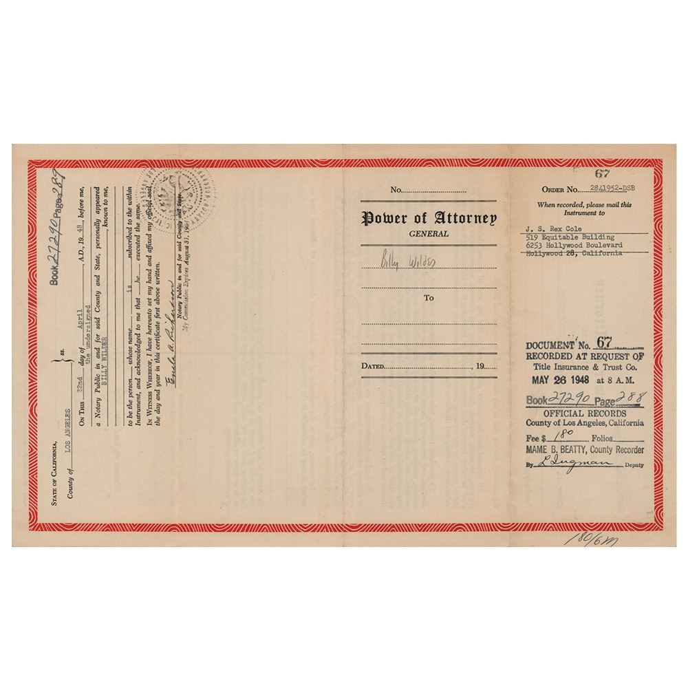 DS, one page, 8.5 x 14, April 22, 1948. Power of attorney whereby Billy Wilder appoints J. S. Rex Cole as his personal attorney. Signed at the conclusion in black ink by Wilder. In fine condition.