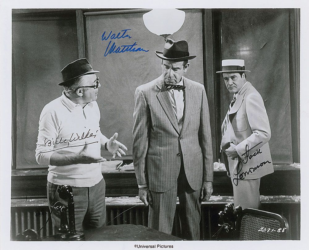 Glossy 10 x 8 photo from the set of The Front Page, signed in blue and black felt tip by Wilder, Matthau, and Lemmon. In fine condition, with some slight surface spotting.