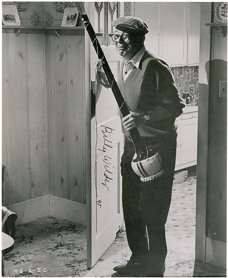 Glossy 7.75 x 9.5 photo of Wilder on set, signed vertically in black felt tip, “Billy Wilder, 95.” In very good condition, with moderate spotting throughout the surface, horizontal streaking to the emulsion, and likely trimmed edges.