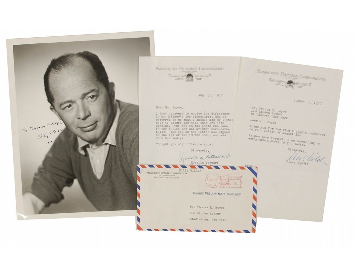 Vintage glossy 8 x 10 photo of Wilder, signed and inscribed in fountain pen, “To Thomas K. Boyce, Billy Wilder 1950;” and a TLS signed by Wilder, one page, 5.5 x 8.5, acknowledging the photo. In very good condition, with scattered creases and a paperclip impression to top edge of photo. Accompanied by a 1950 TLS from Wilder’s secretary clearing up the apparent different look to the signatures. “The one on the photo was done in the office and was written more carefully. The one on the letter was signed on the set of Ace in the Hole, and was done hurriedly.”