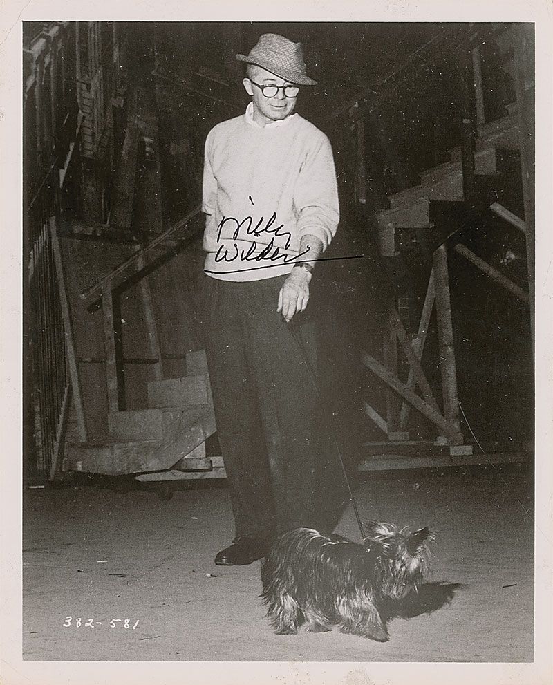 Glossy 8 x 10 photo of Wilder on set with a small dog, signed in black felt tip. Light corner tip creases and a few trivial surface dings and impressions, otherwise fine condition.