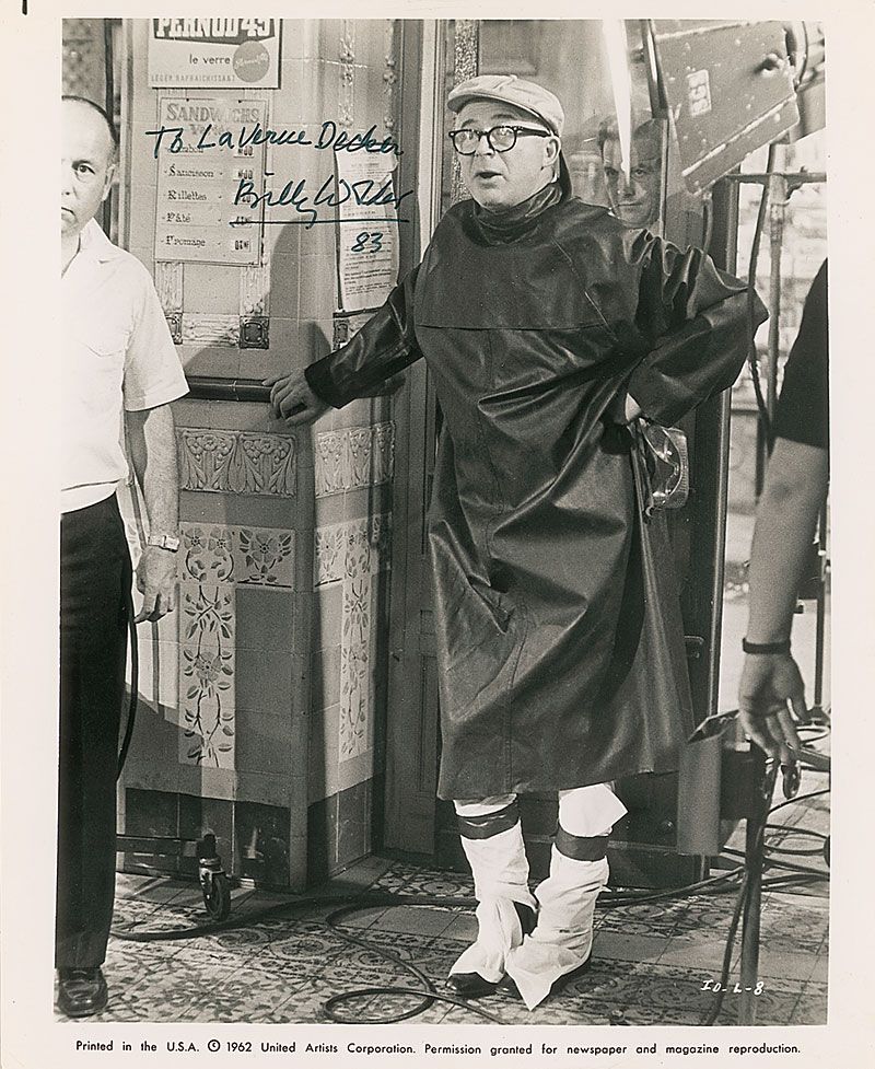 Glossy 8 x 10 publicity photo of Wilder, signed and inscribed in black felt tip, “To LaVerne Decker, Billy Wilder, 83.” In fine condition.