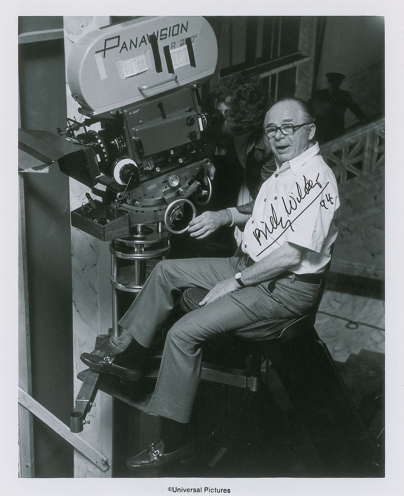 Glossy 8 x 10 Universal Pictures publicity photo of Billy Wilder seated behind a Panavision film camera, signed in black ink. In very good to fine condition, with a crease to the lower right corner, and two small envelope clasp impressions near the top border.
