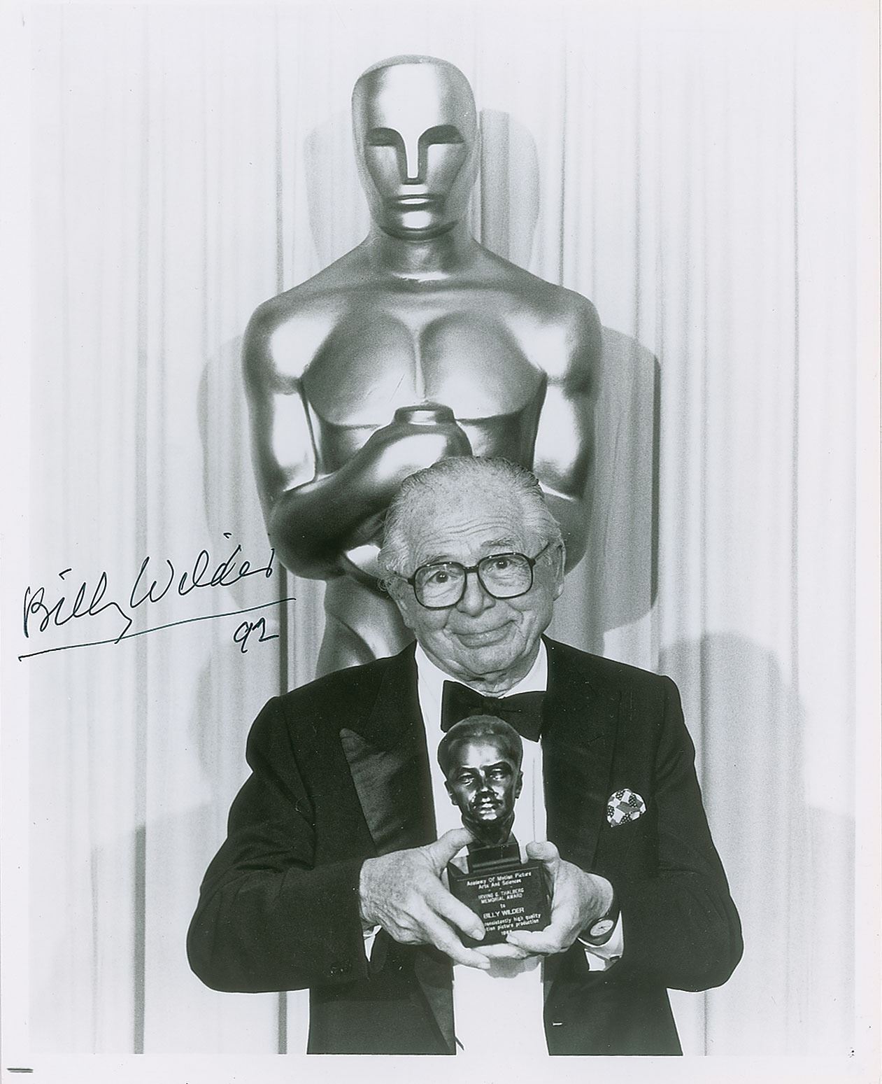 Glossy 8 x 10 photo of Wilder holding his Irving E. Thalberg Memorial Award, signed in black felt tip, "Billy Wilder, 92." In very fine condition.