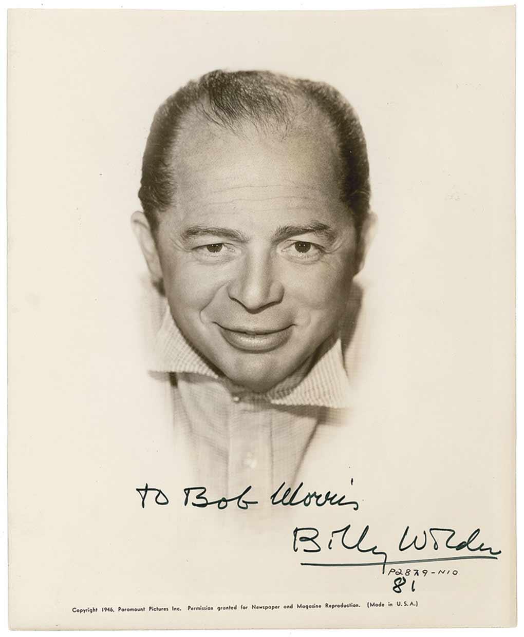 Highly esteemed, versatile, Oscar-winning, Austrian-American director and screenwriter (1906β2002) who helmed such all-time classics as Double Indemnity, Sunset Boulevard, The Apartment, and Some Like It Hot. Vintage glossy 8 x 10 Paramount photo, signed and inscribed later in black felt tip βTo Bob Morris, Billy Wilder 81.β In fine condition, with scattered light surface marks and creases.