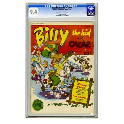 <B>Billy the Kid and Oscar #1 Crowley Copy pedigree (Fawcett, 1945) CGC NM 9.4 Cream to off-white pages.</B></I> This is the sole highest-graded copy of this funny animal mag. Overstreet 2005 NM- 9.2 value = $160. CGC census 12/05: 1 in 9.4, none higher.