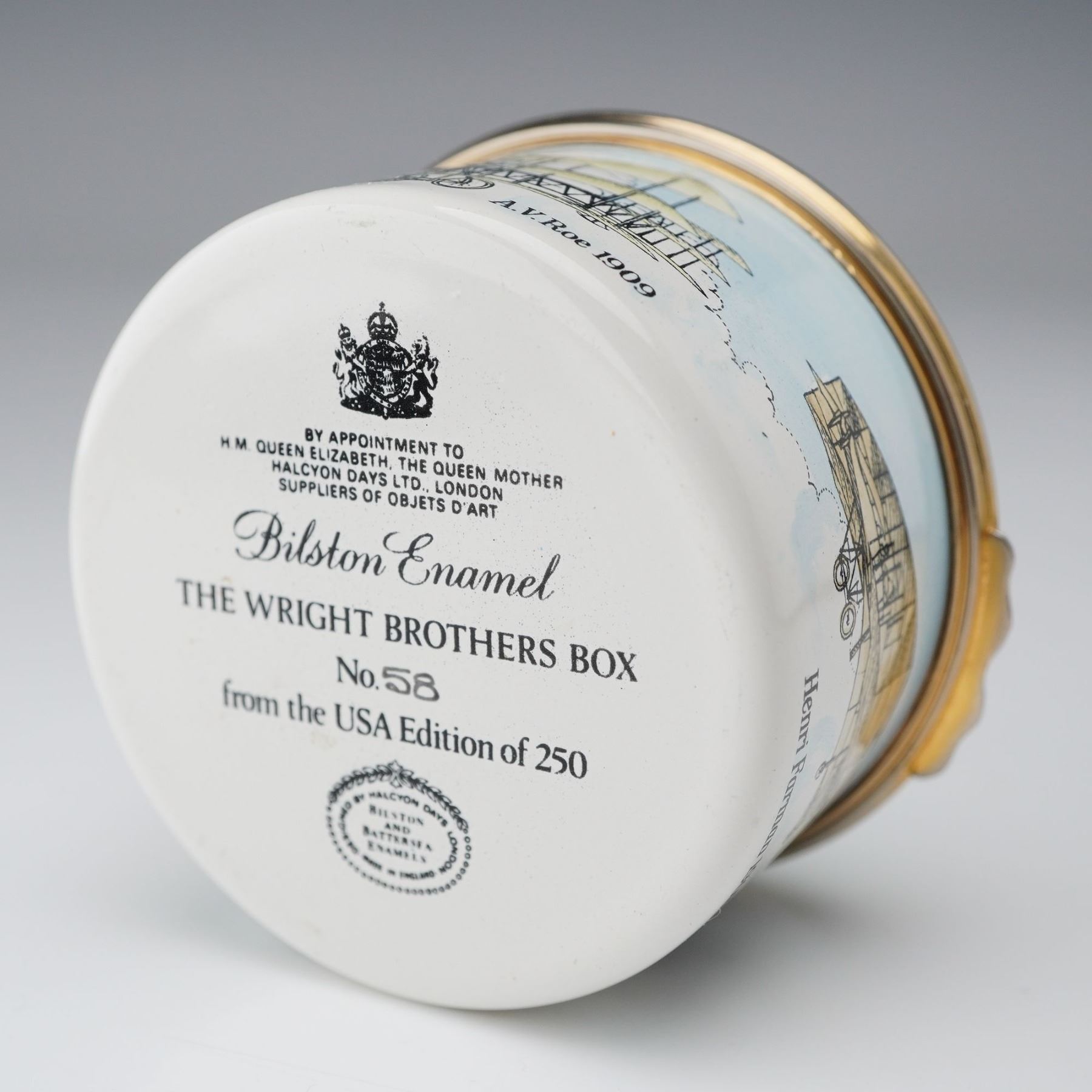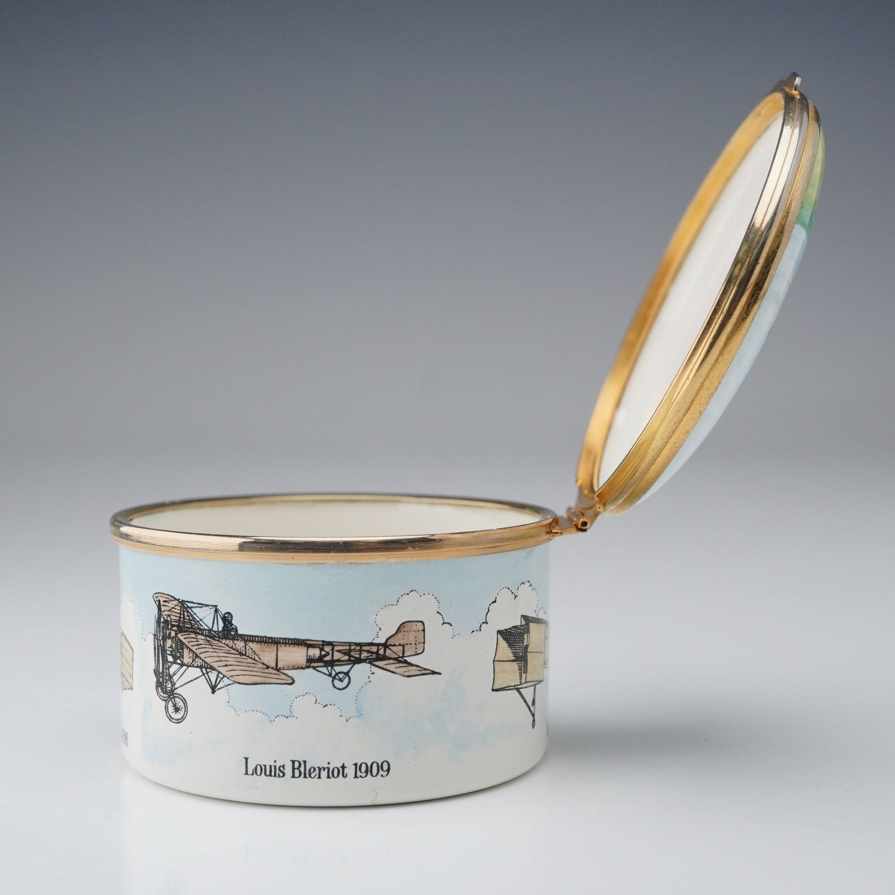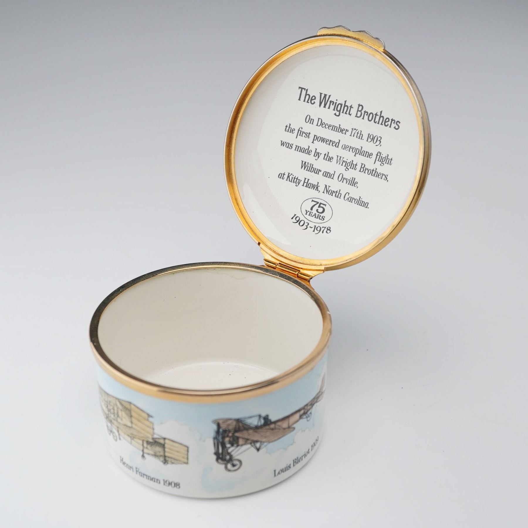 This enamel box by Bilston features a colorful depiction of the Wright Brothers' first flight in 1903. The intricate design includes images of various aircraft, including the Wright brothers' Flyer 1 and Louis Bleriot's 1909 plane. The box is crafted in enamel with detailed illustrations and a gold-tone trim. The base of the box features the official mark By Appointment to H.M. Queen Elizabeth, The Queen Mother, acknowledging the royal association. This collectible box commemorates the 75th anniversary of the Wright Brothers' achievement.