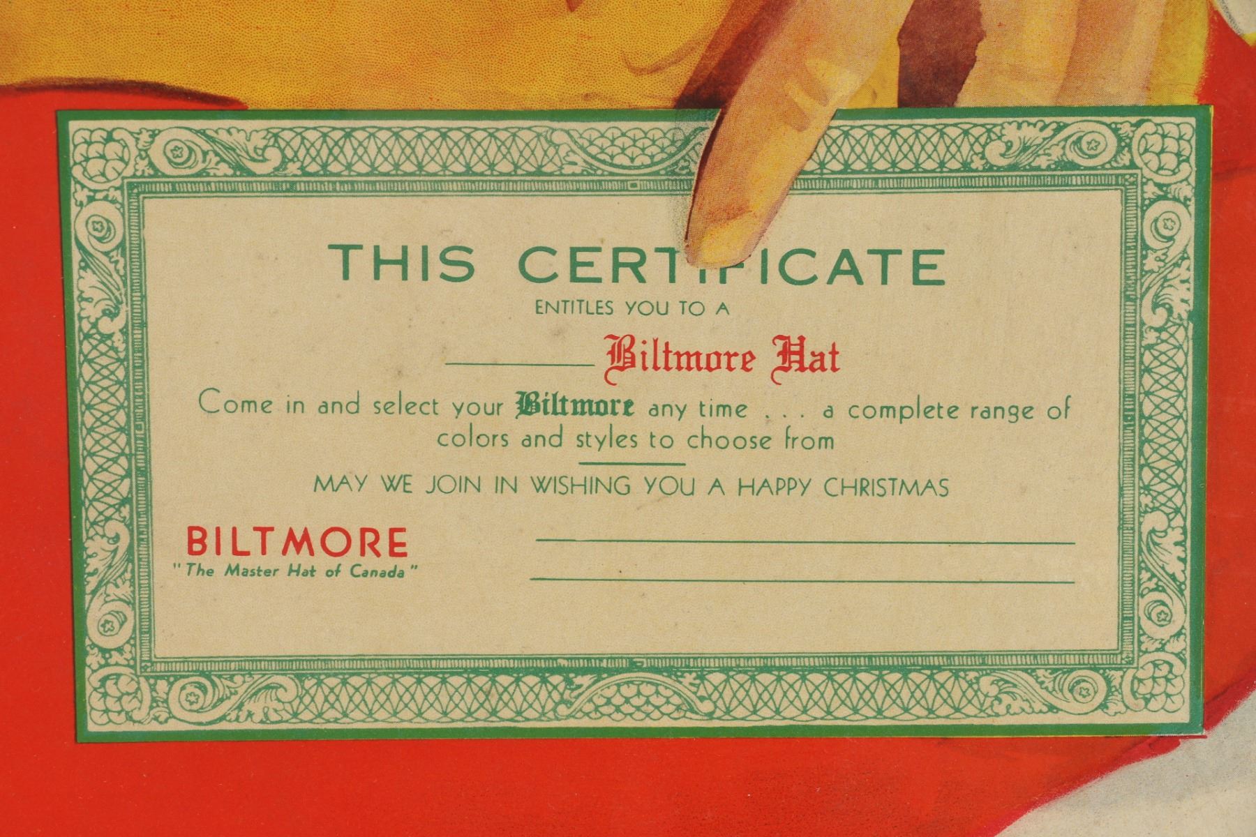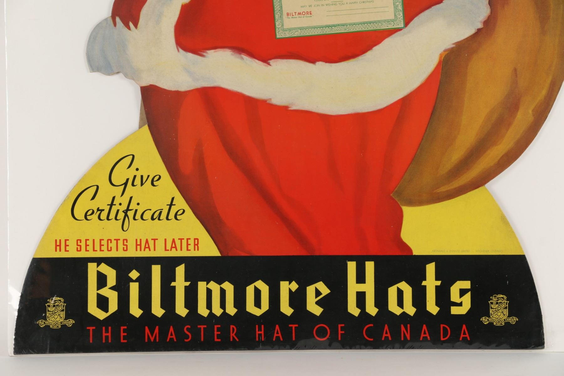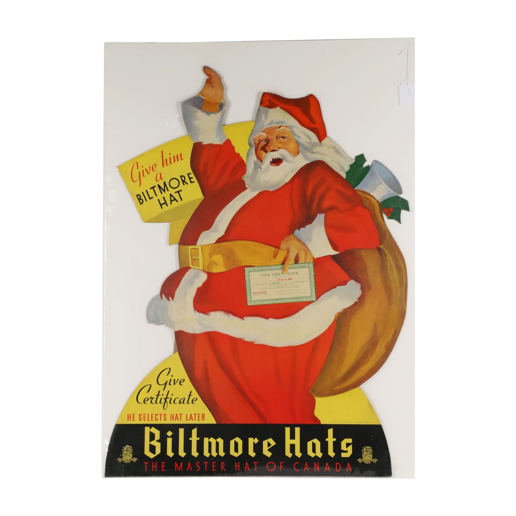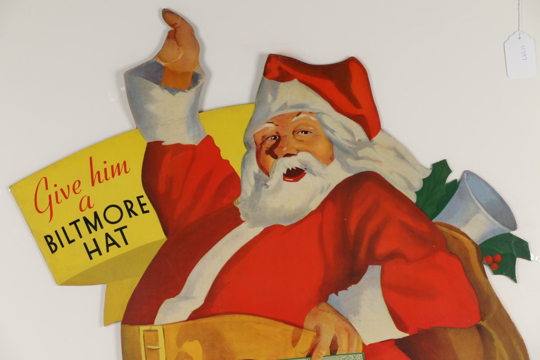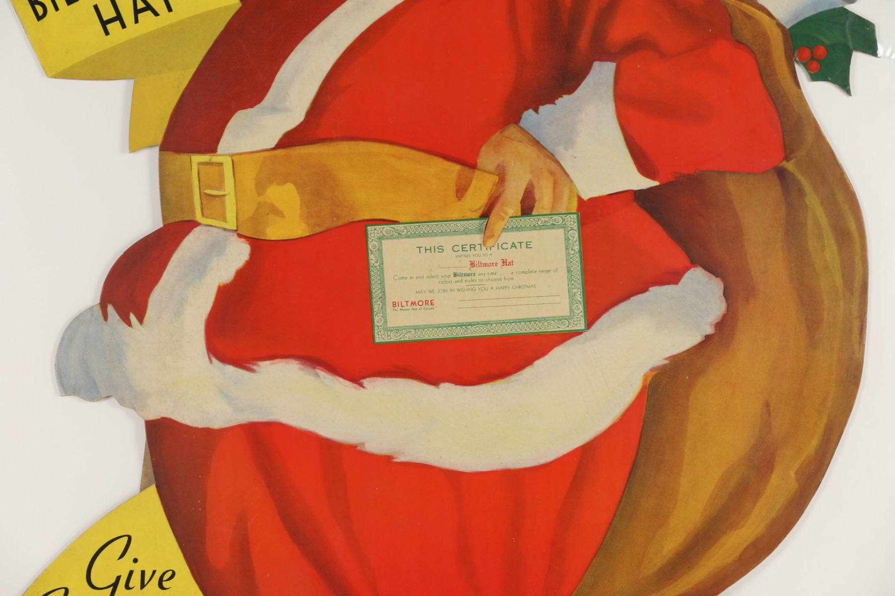 Circa 1940s. Heavy die-cut cardboard sign. Easel-back store display featuring Santa Claus. 42.5" x 30". Exceptional condition. No fading, stain, or moisture-related damage. $200-300.