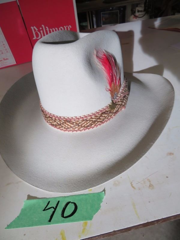Biltmore Silver Buckle Brand Rusty, maple leaf pin & brown feather on band Size 7 1/8th quality 4x