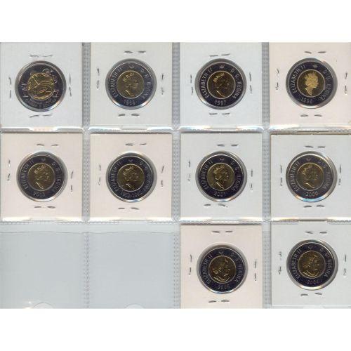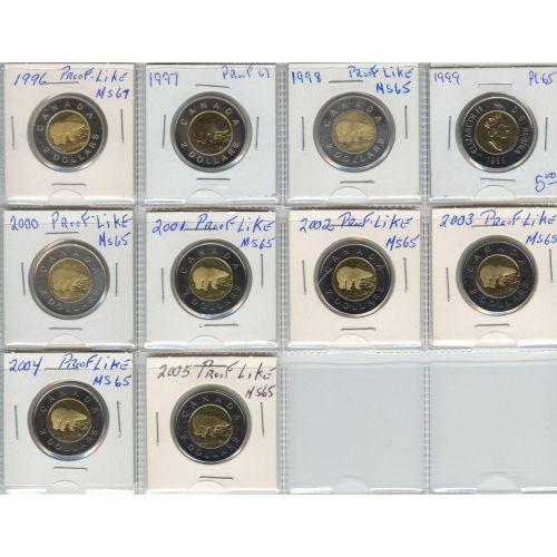 Bimetalic 2 Dollars Collection of 10; 1996 Proof UHC, 1997 SP-66, 1998W UNC- 65, 1999 Nunavut UNC-65, 2000W UNC-65, 2001 UNC-65, 2002 UNC-65, 2003 UNC-65, 2004 UNC-65 & 2005 UNC-65. To be viewed, sold as is no return.