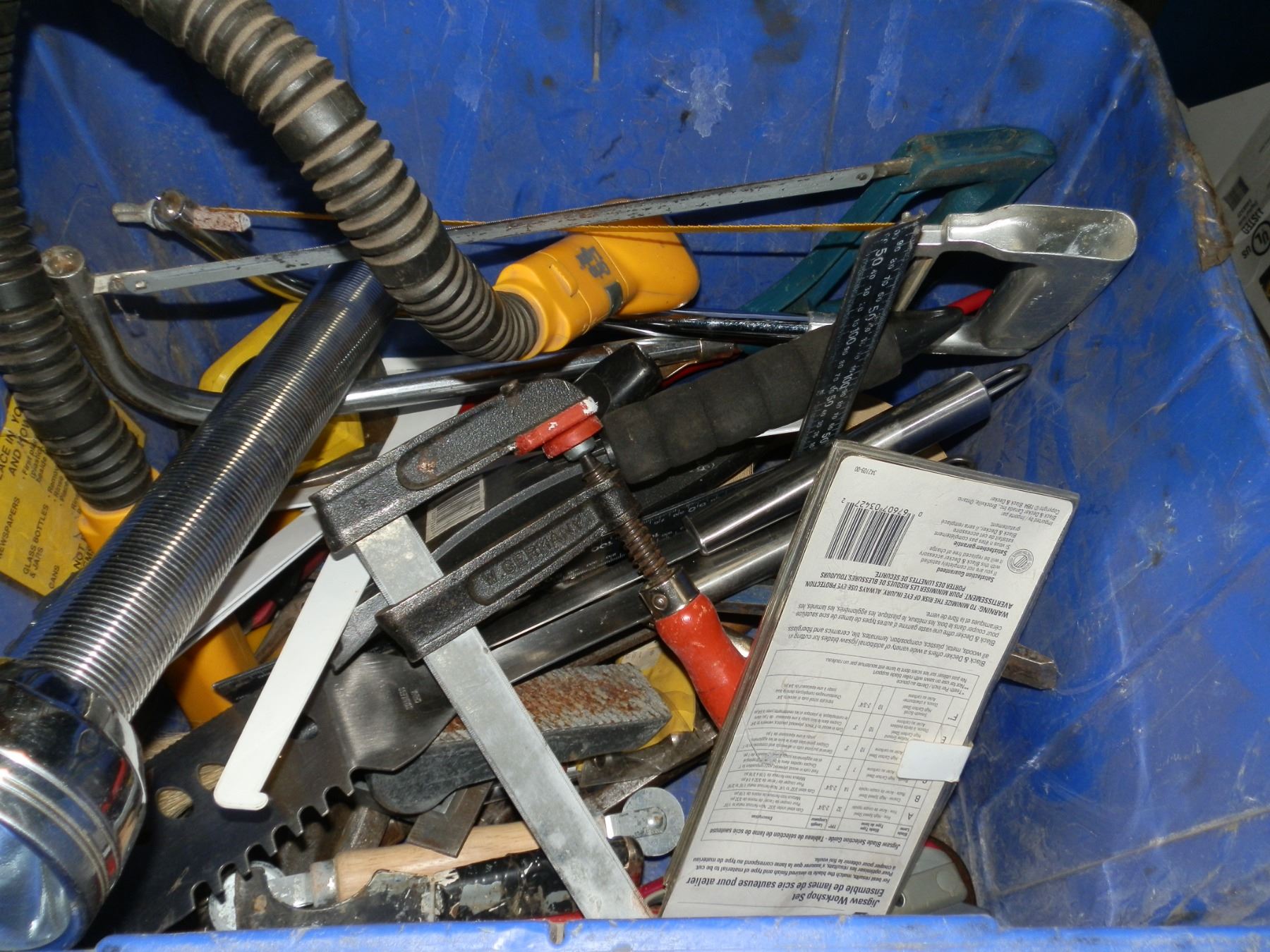 Bin Of Mixed Tools, hack saws, small hand tools, job light, jig saw blades clamps and more you get the whole bin for one money...used