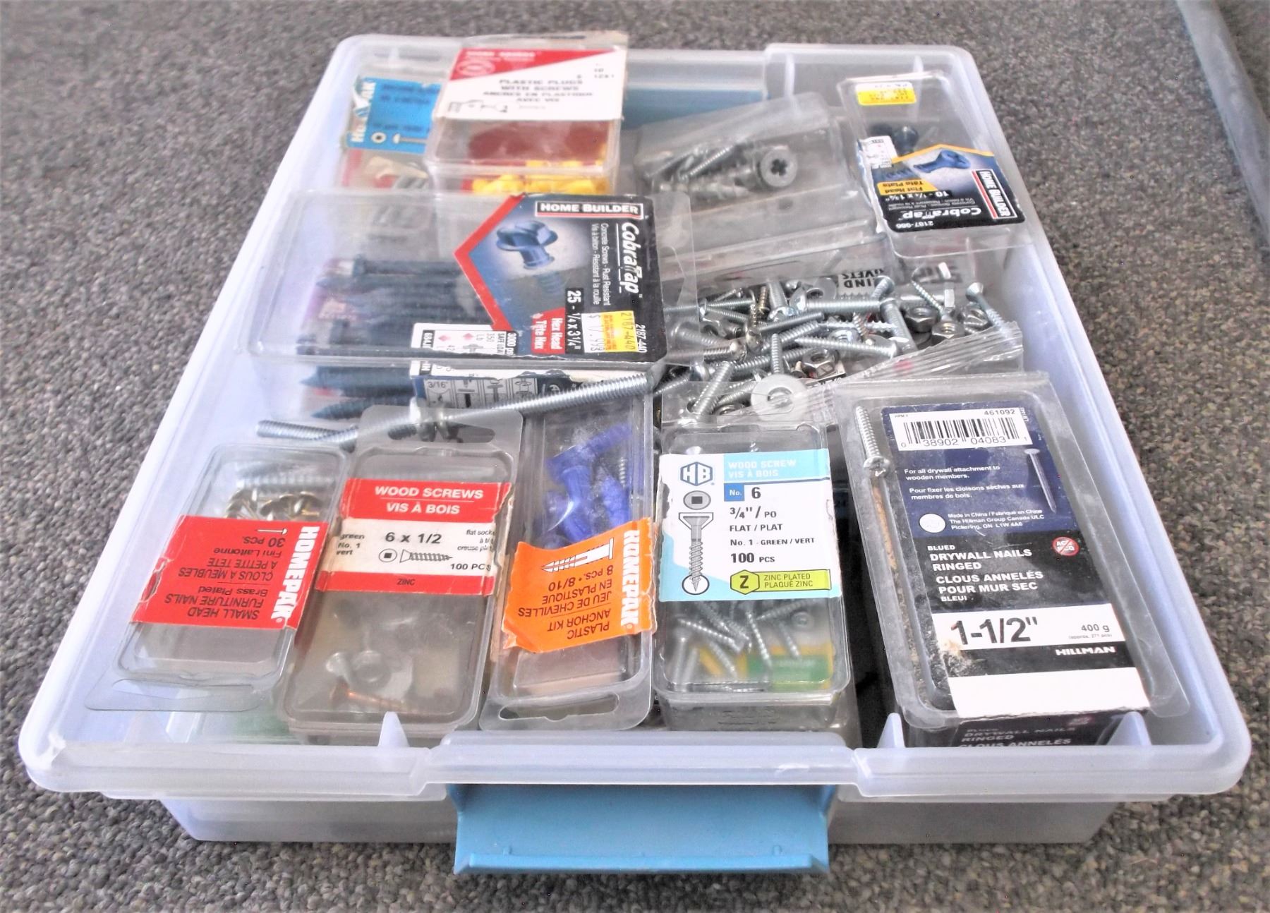 Bin of Assorted Nuts, Screws, Nails, etc.