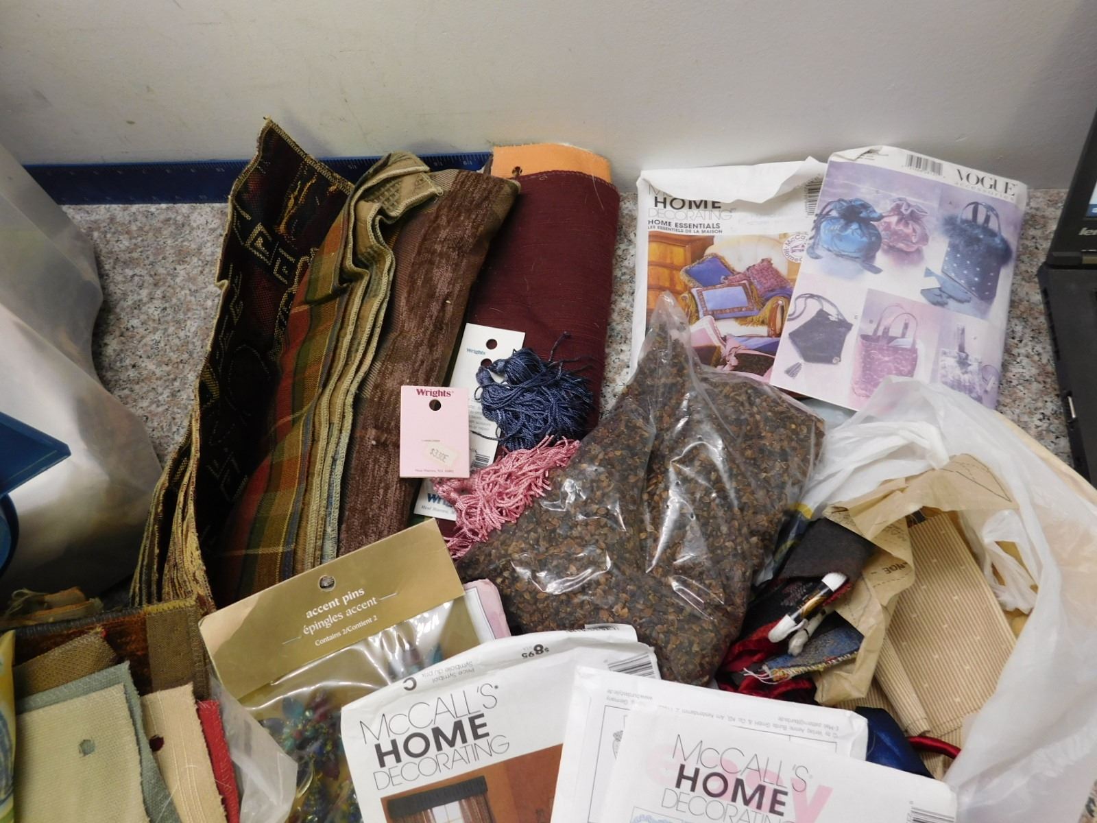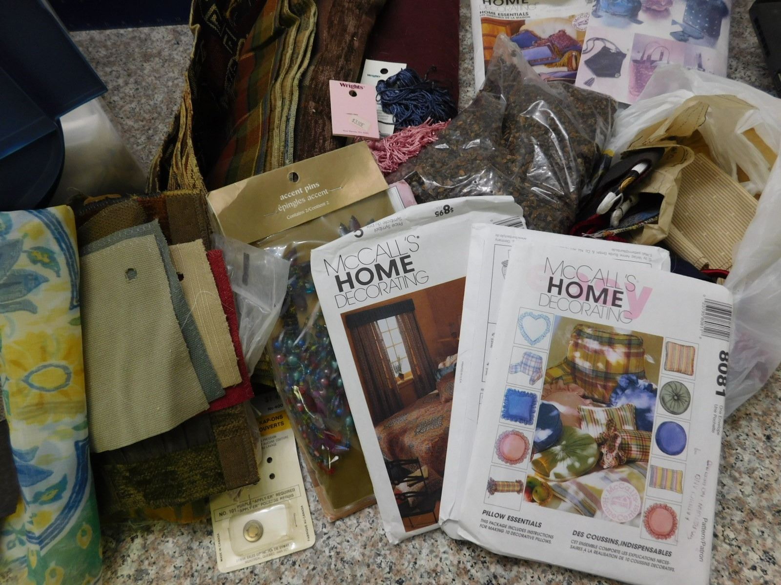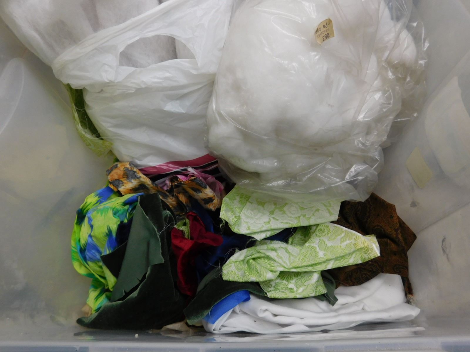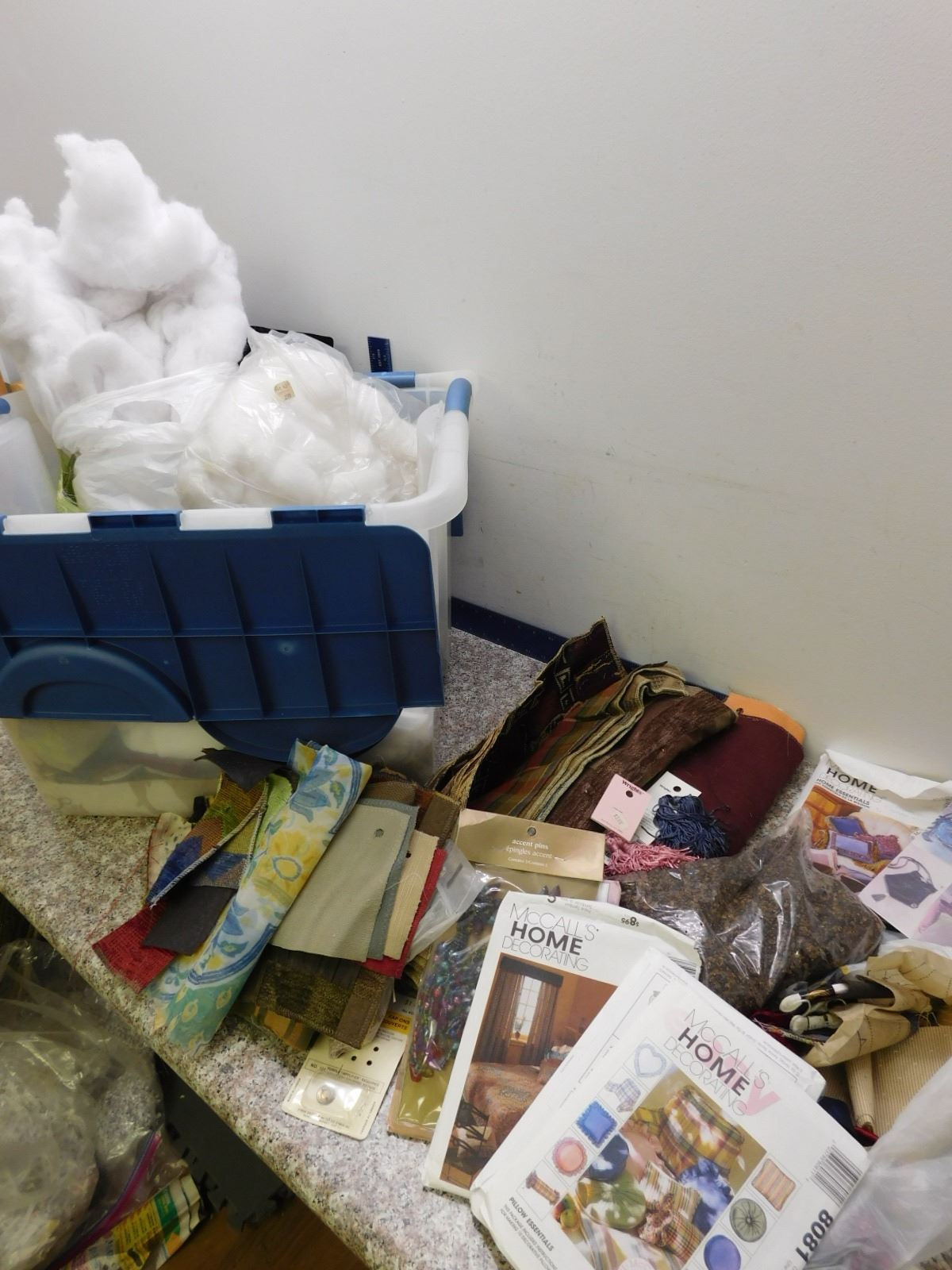 Bin of Crafting Supplies, Patterns, Fabric, Tassels, Stuffing, Bin Included