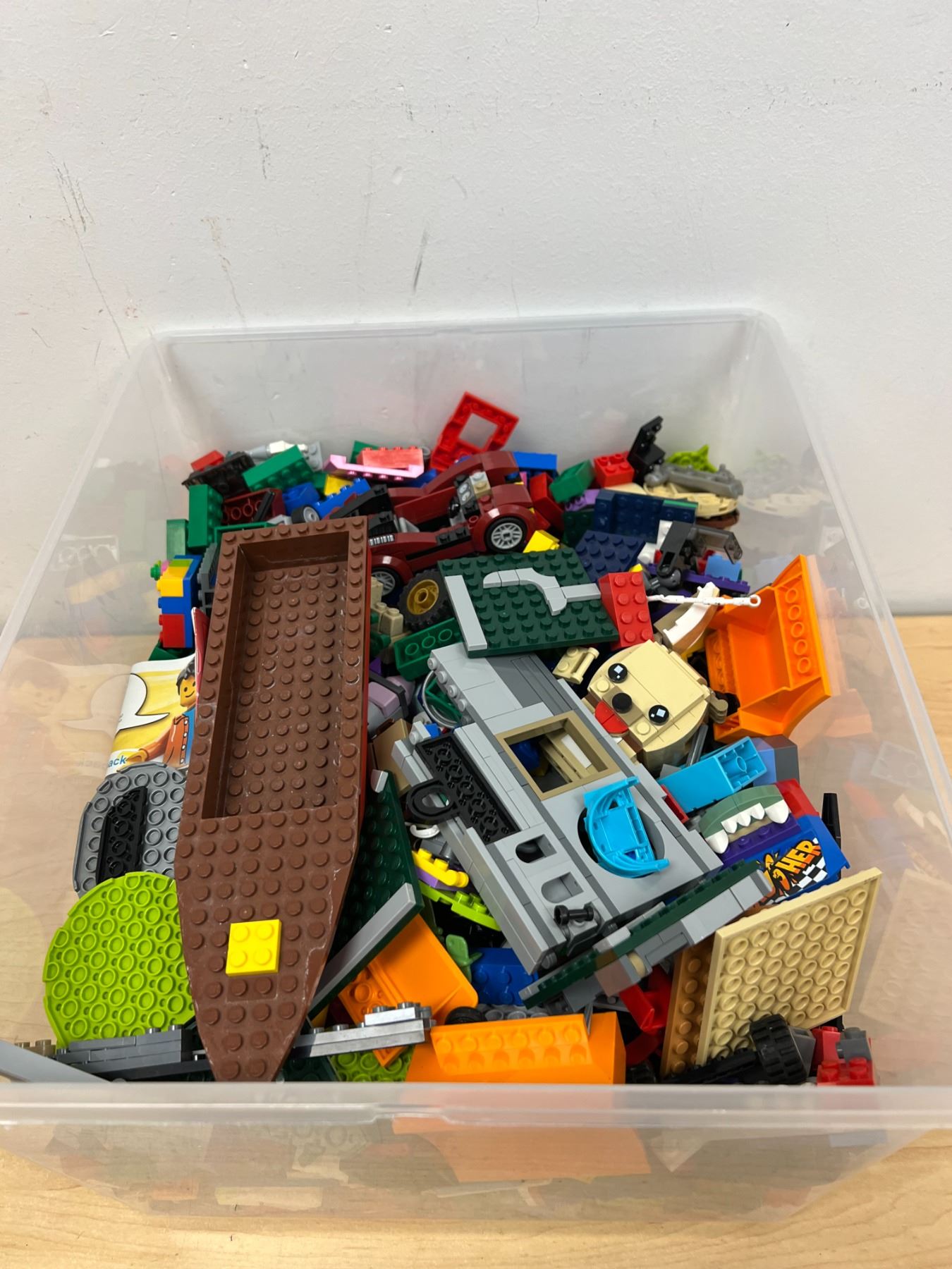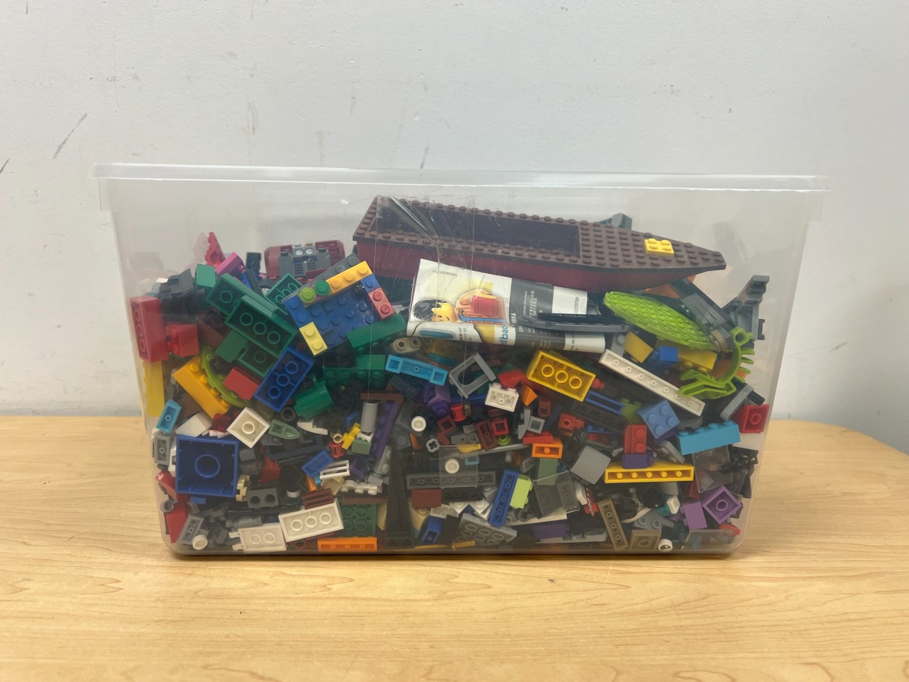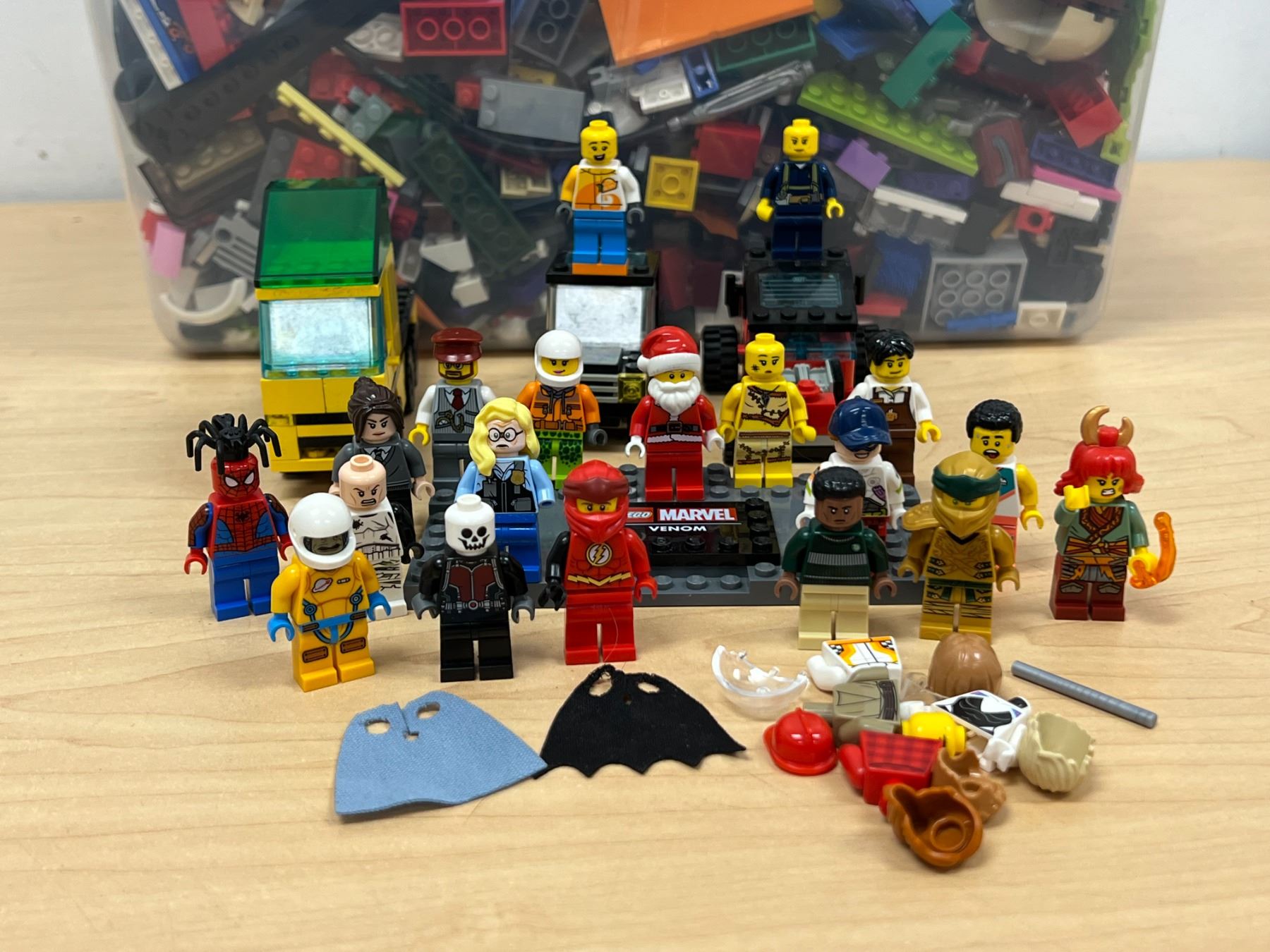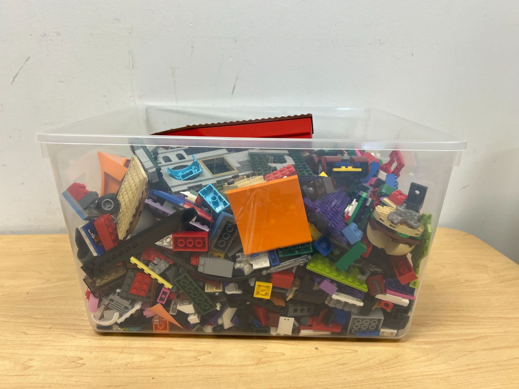Bin of Lego with Mini Figures Minifigs - see all photos for details - bin approx: 13.5x11" & 8"T - it looks like mostly Lego but we didn't examine each piece.