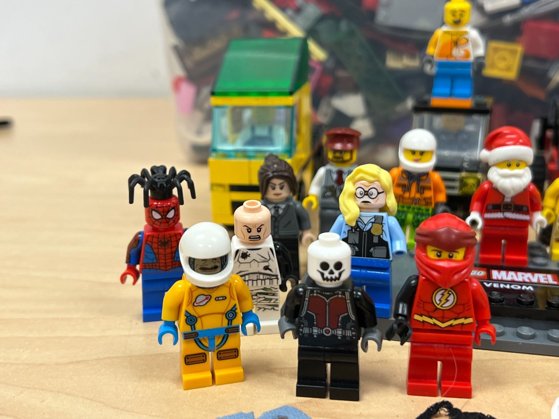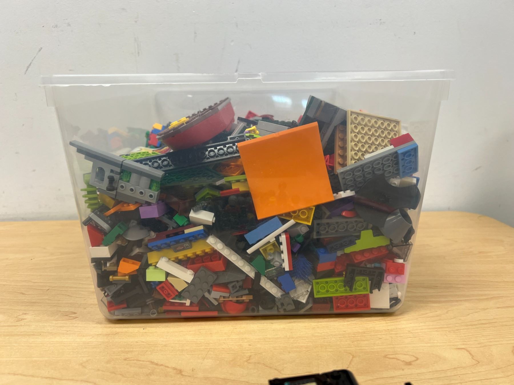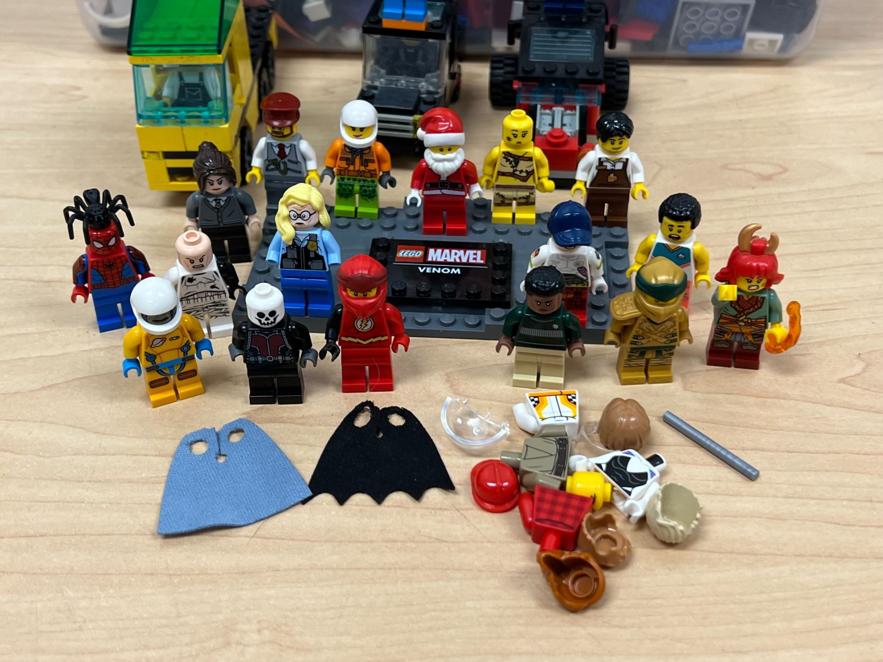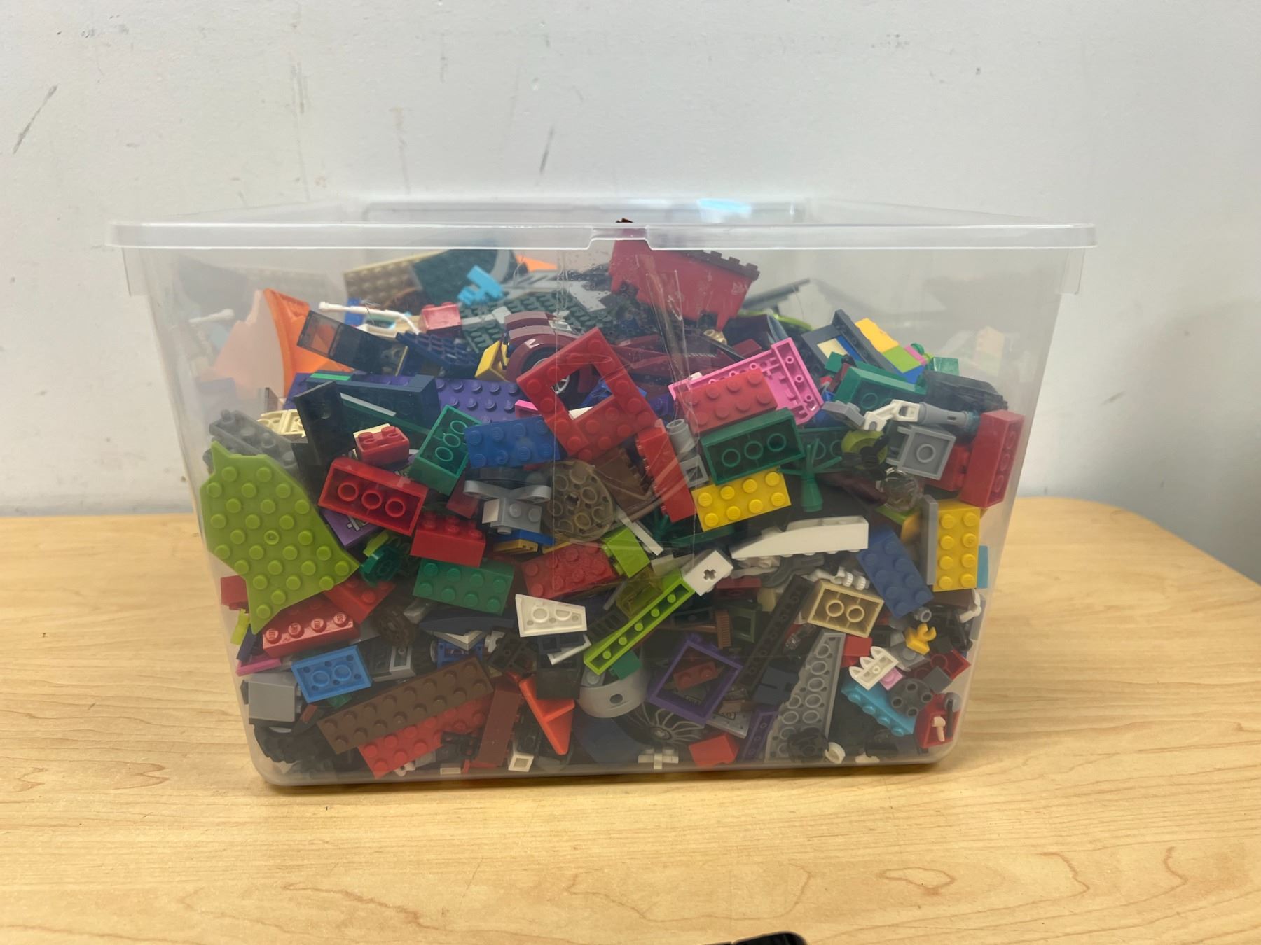 Bin of Lego with Mini Figures Minifigs - see all photos for details - bin approx: 13.5x11" & 8"T - it looks like mostly Lego but we didn't examine each piece.