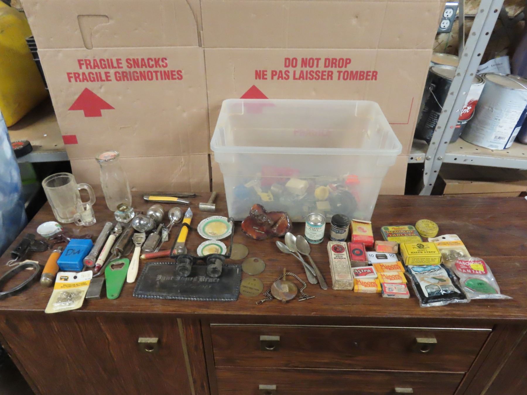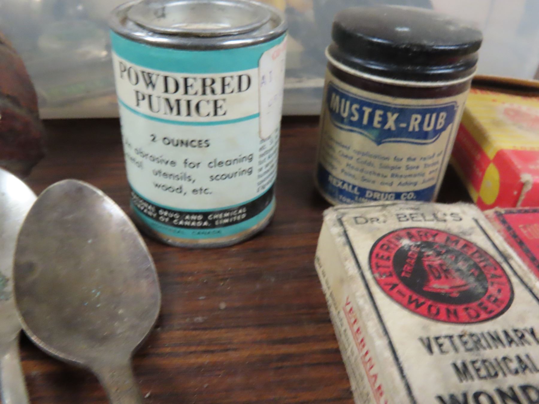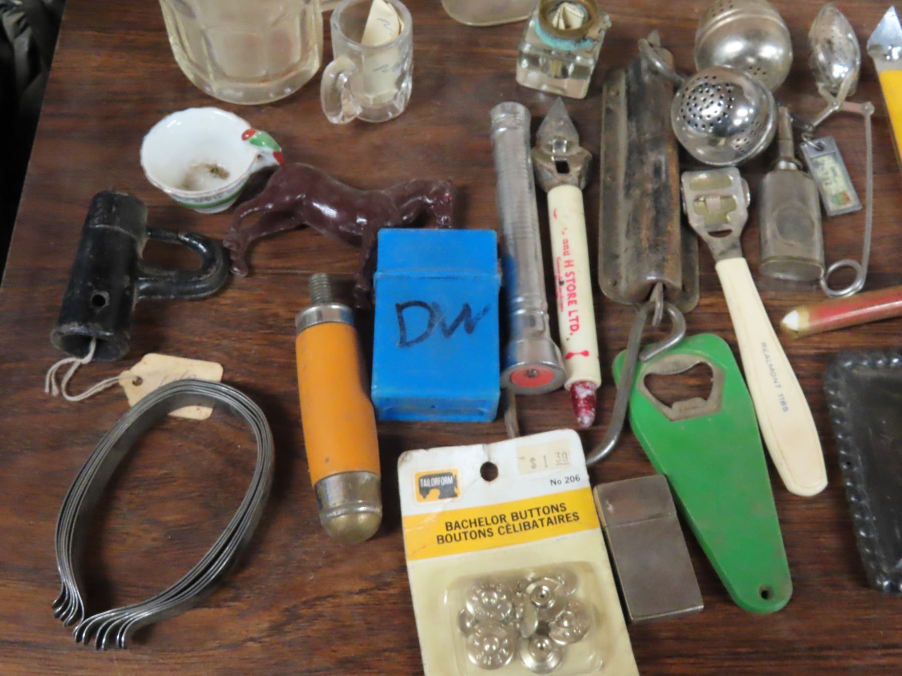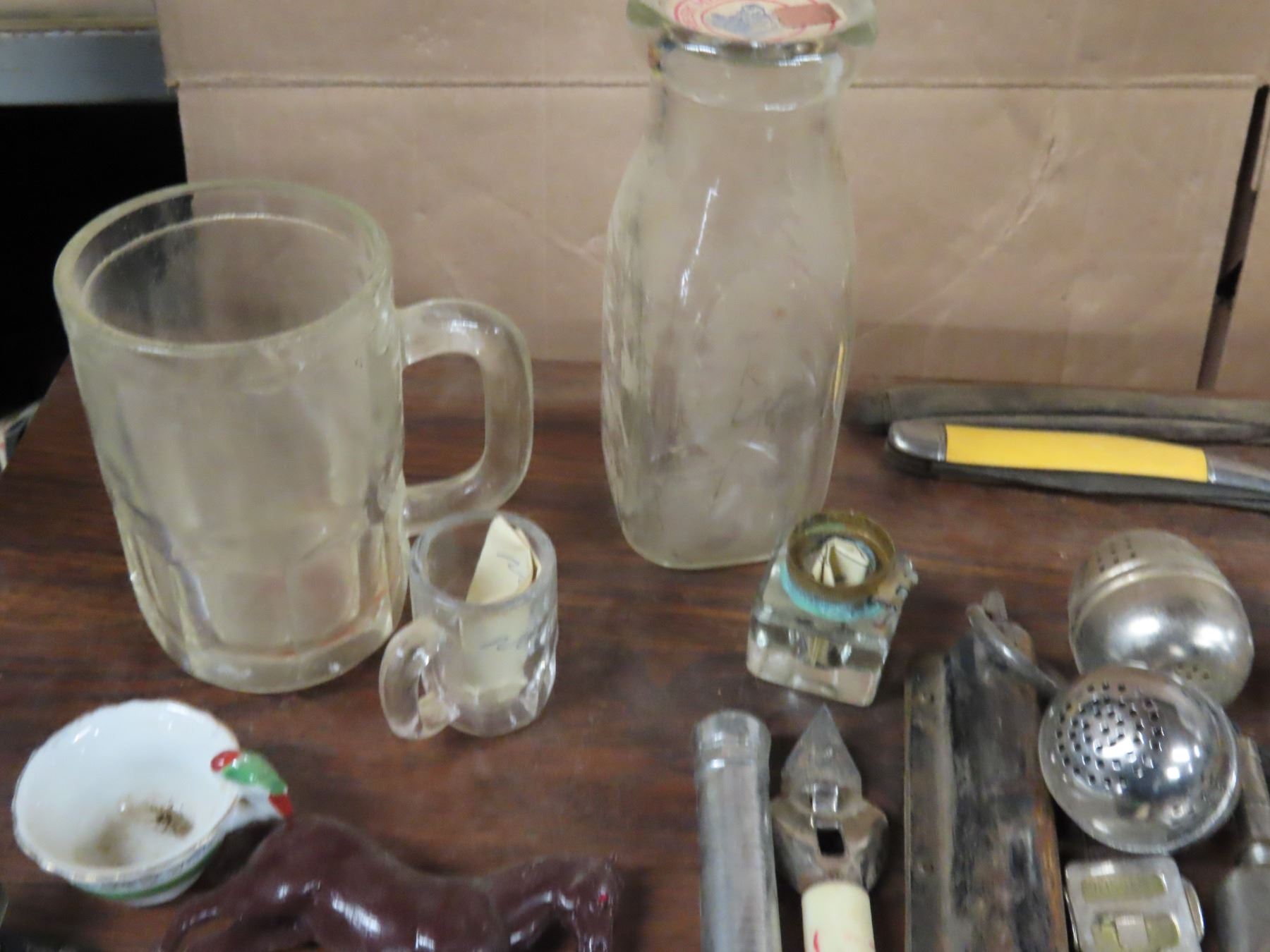 Bin of Misc Items including: Glass Jar / Cups / Can Opener / Mini RCMP / Mustex Rub