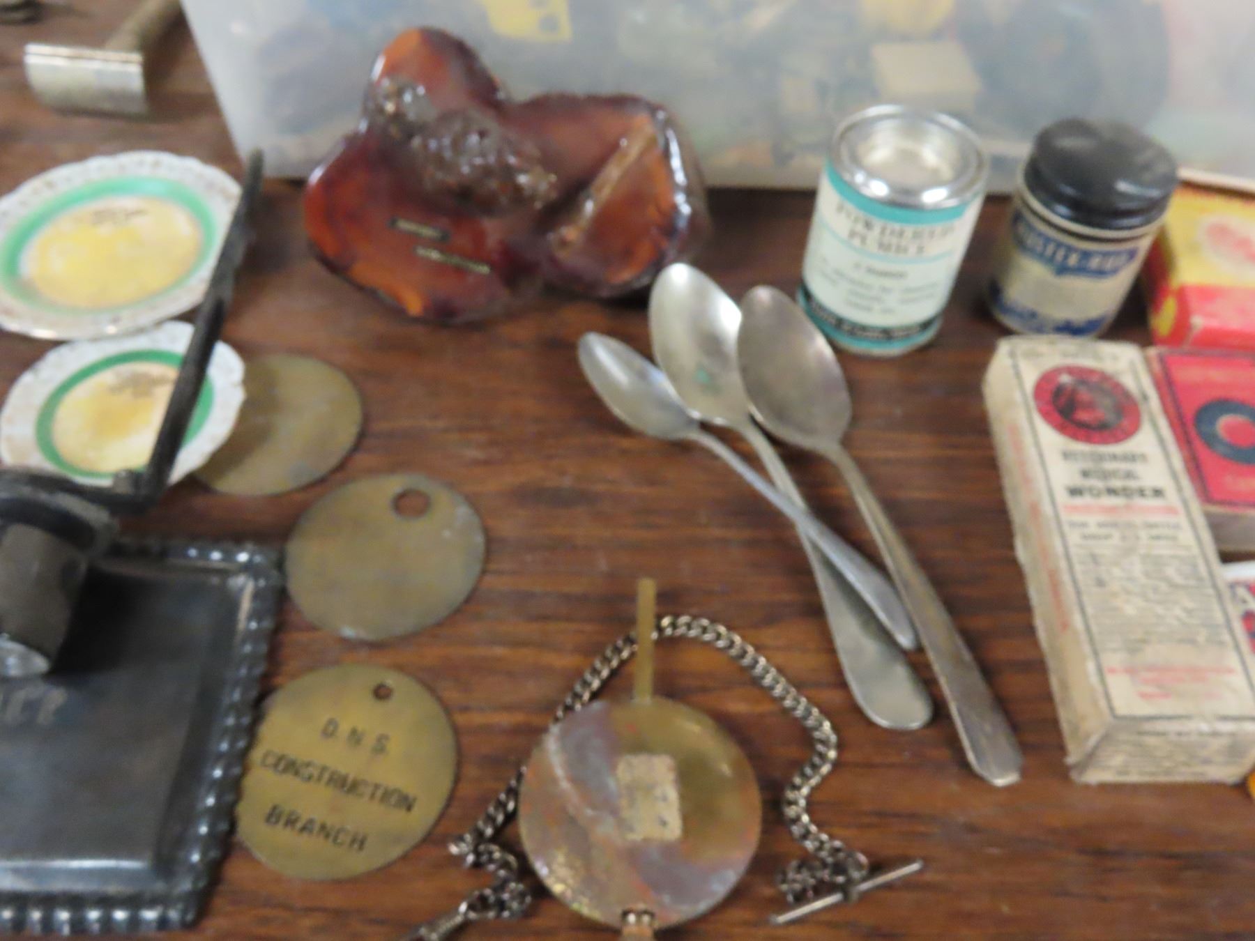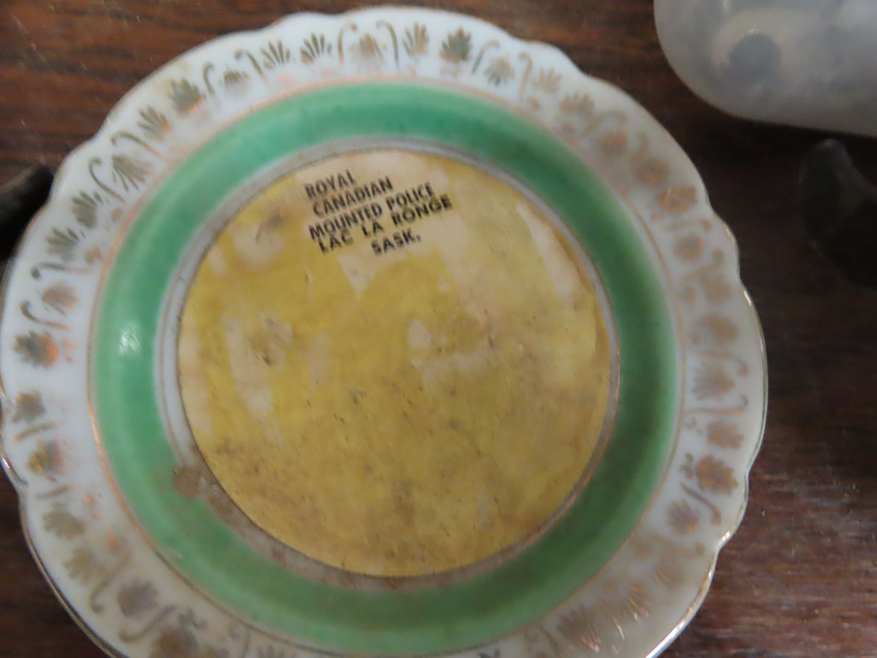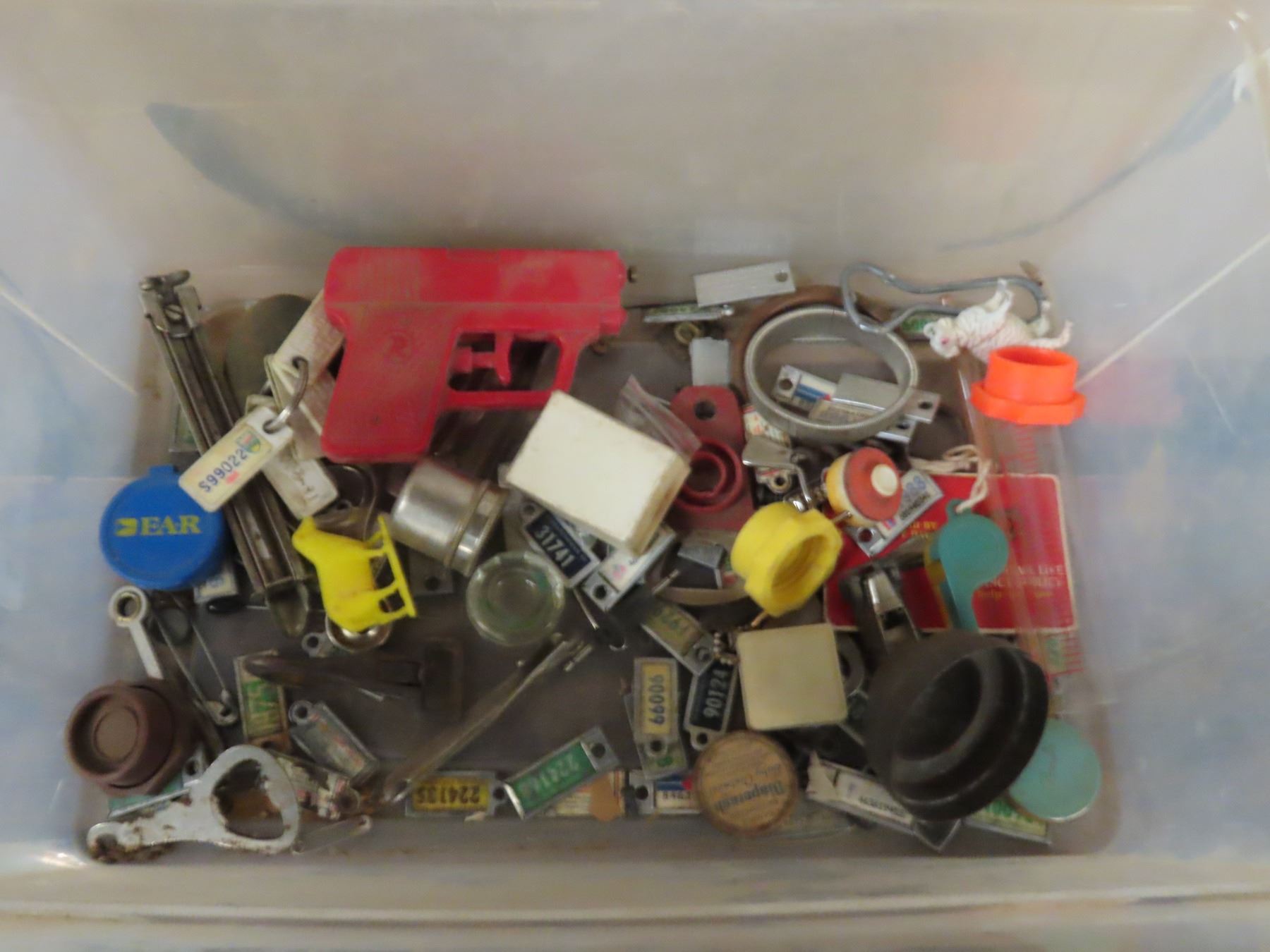 Bin of Misc Items including: Glass Jar / Cups / Can Opener / Mini RCMP / Mustex Rub