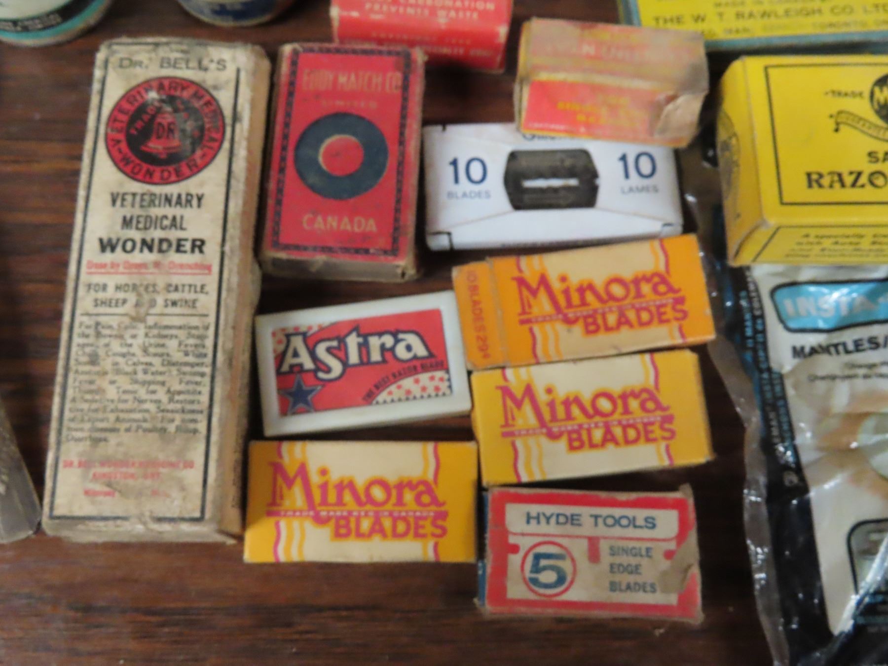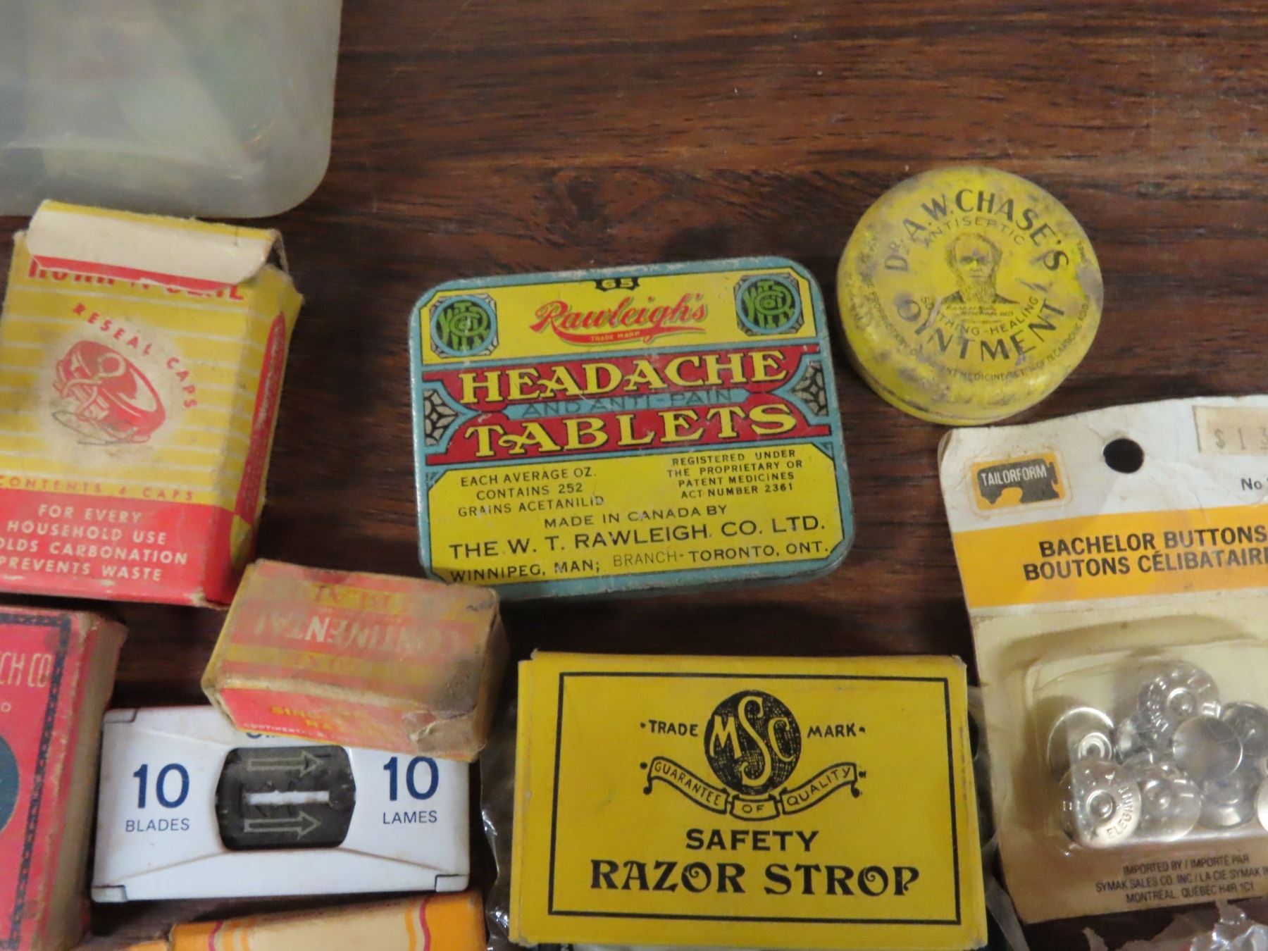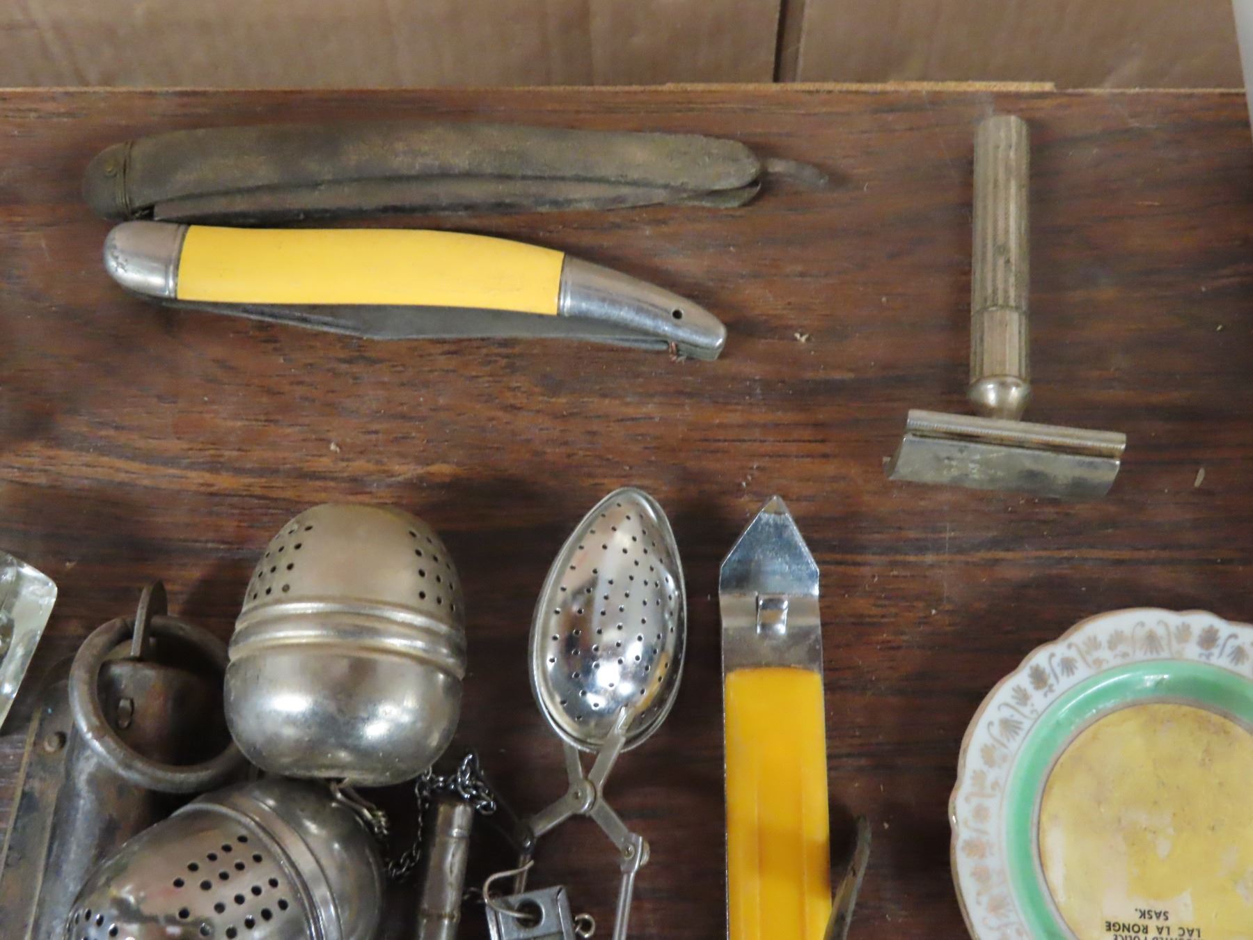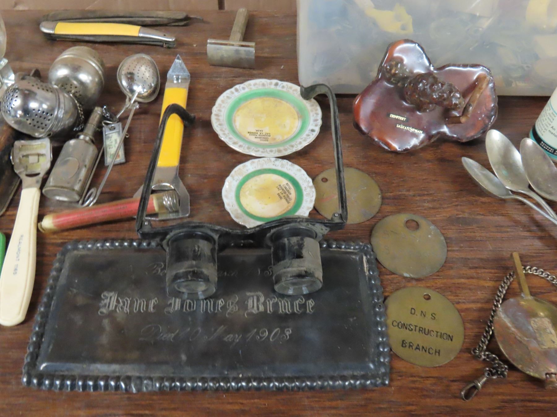 Bin of Misc Items including: Glass Jar / Cups / Can Opener / Mini RCMP / Mustex Rub