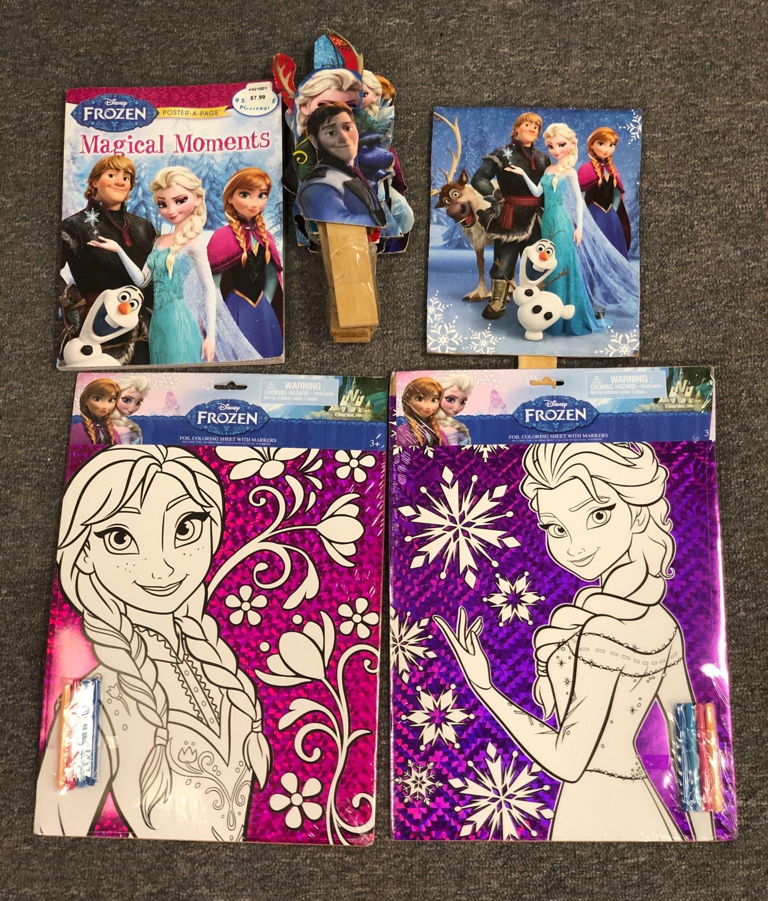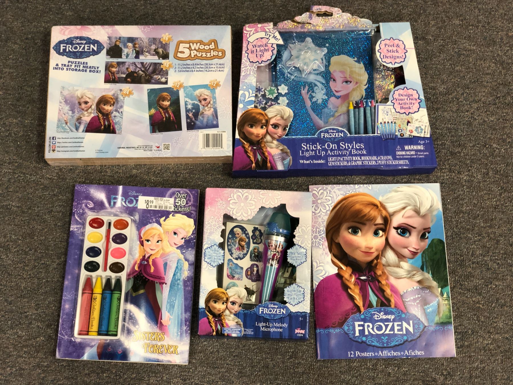 Bin of assorted Frozen movie posters & items - includes light-up melody microphone / NEW wood puzzle / light up activity book etc