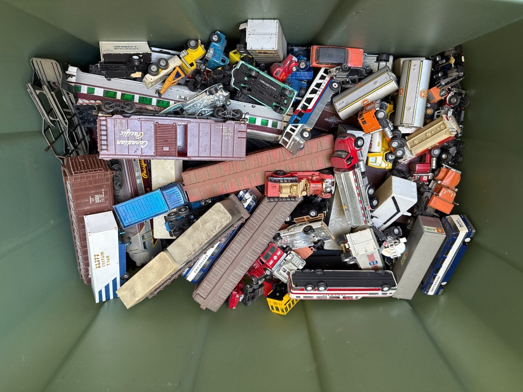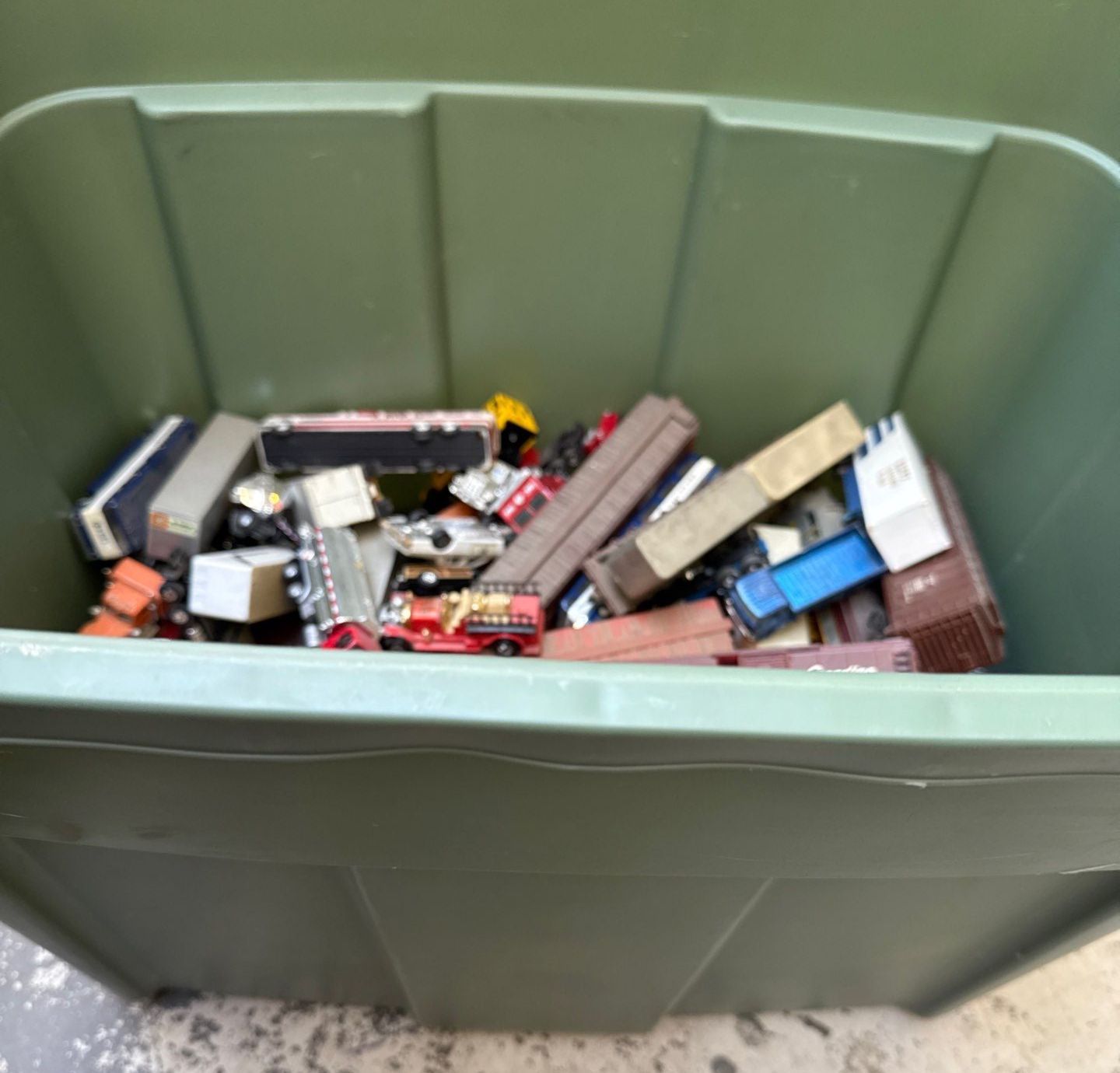 Bin w/ Assortment of Toy Train & Car Pieces