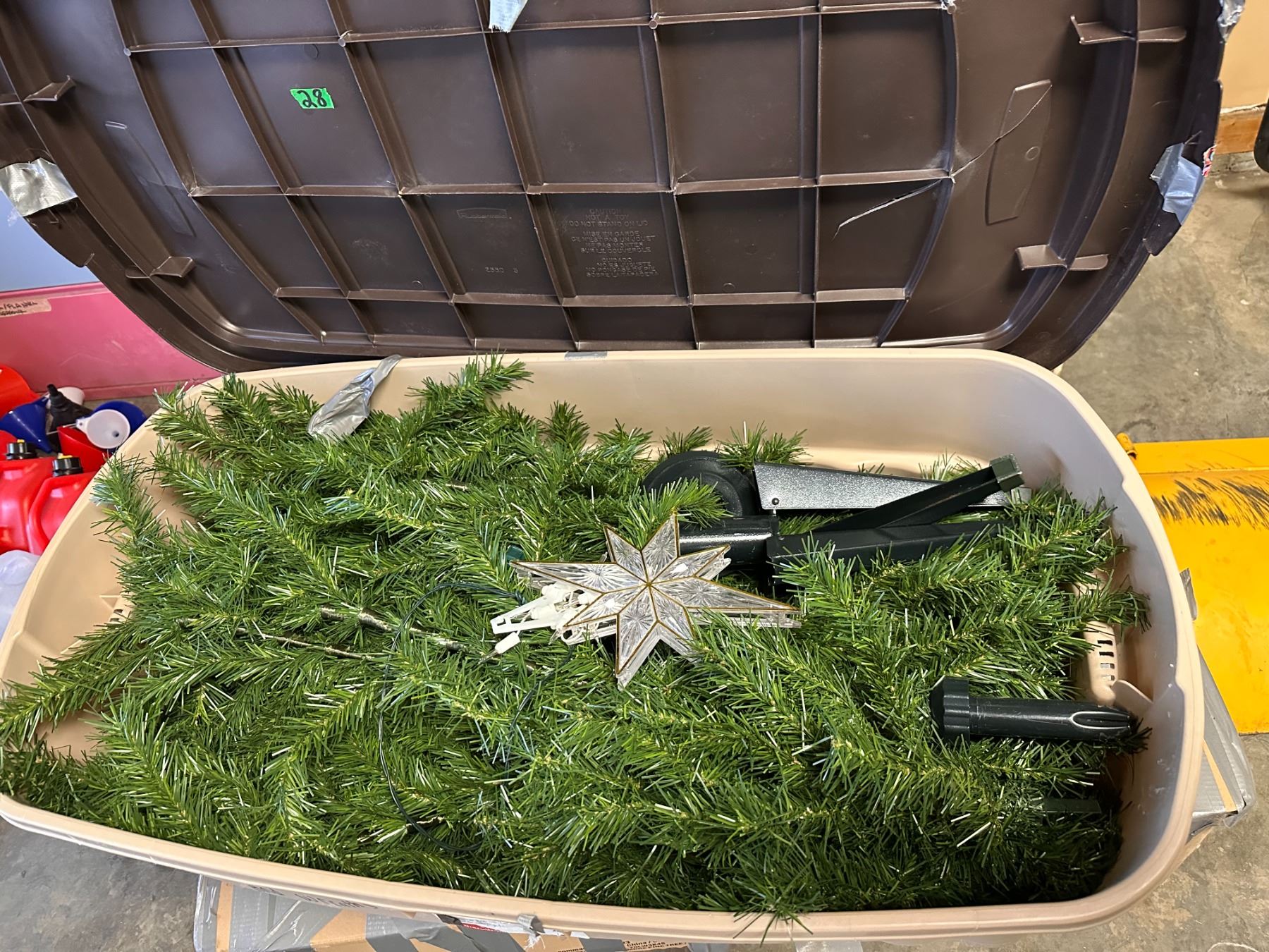 Bin with artificial Christmas tree approx 6 ft - no lights