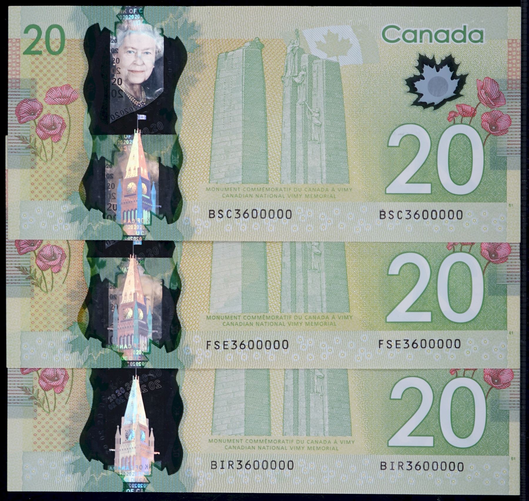Binary Notes; 2012 $20 #FSE3600000, #BSC3600000 & #BIR3600000. Lot of 3 notes with same serial number VF to EF average.