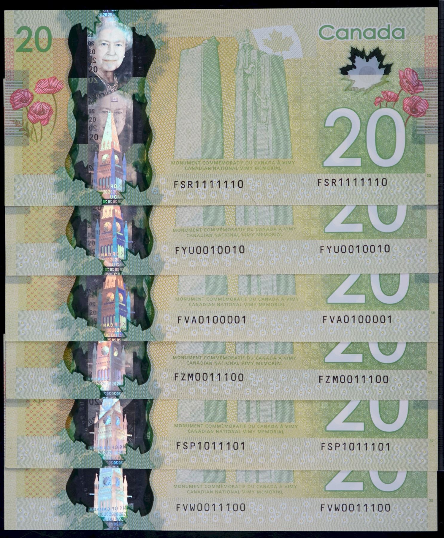 Binary Notes; 2012 $20 #FSR1111110, #FYU0010010, #FVA0100001, #FZM0011100, #FSP1011101 & #FVW0011100. Includes RADAR issues. VF to EF average.