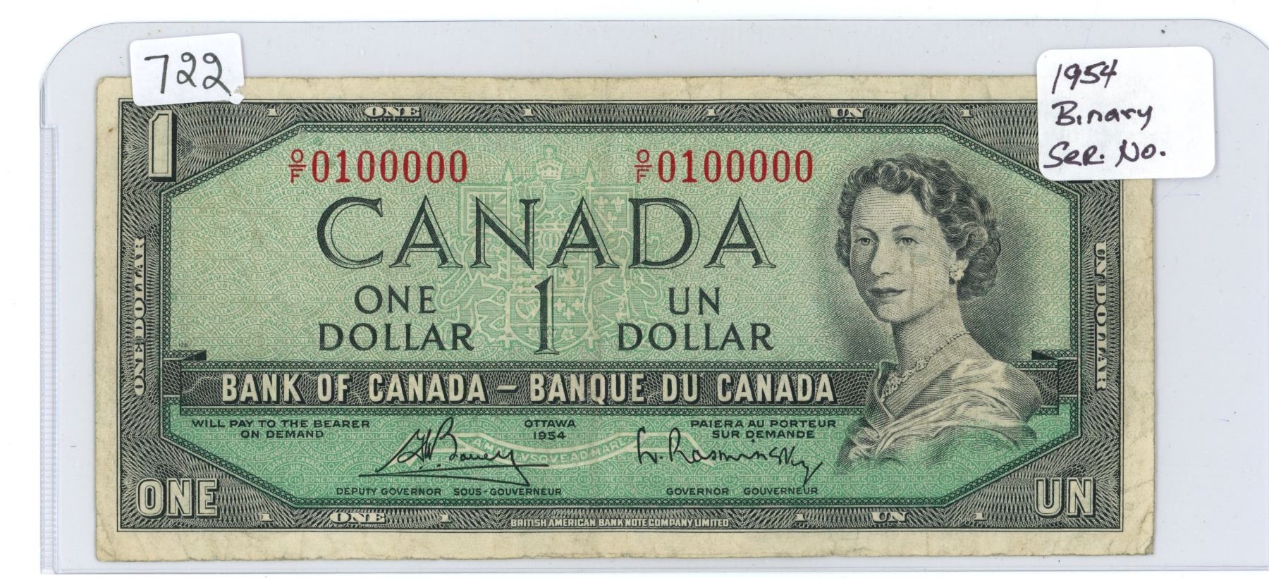Binary serial #O/F 0100000, canada 1954 1bill, bouey/ Rasminsky