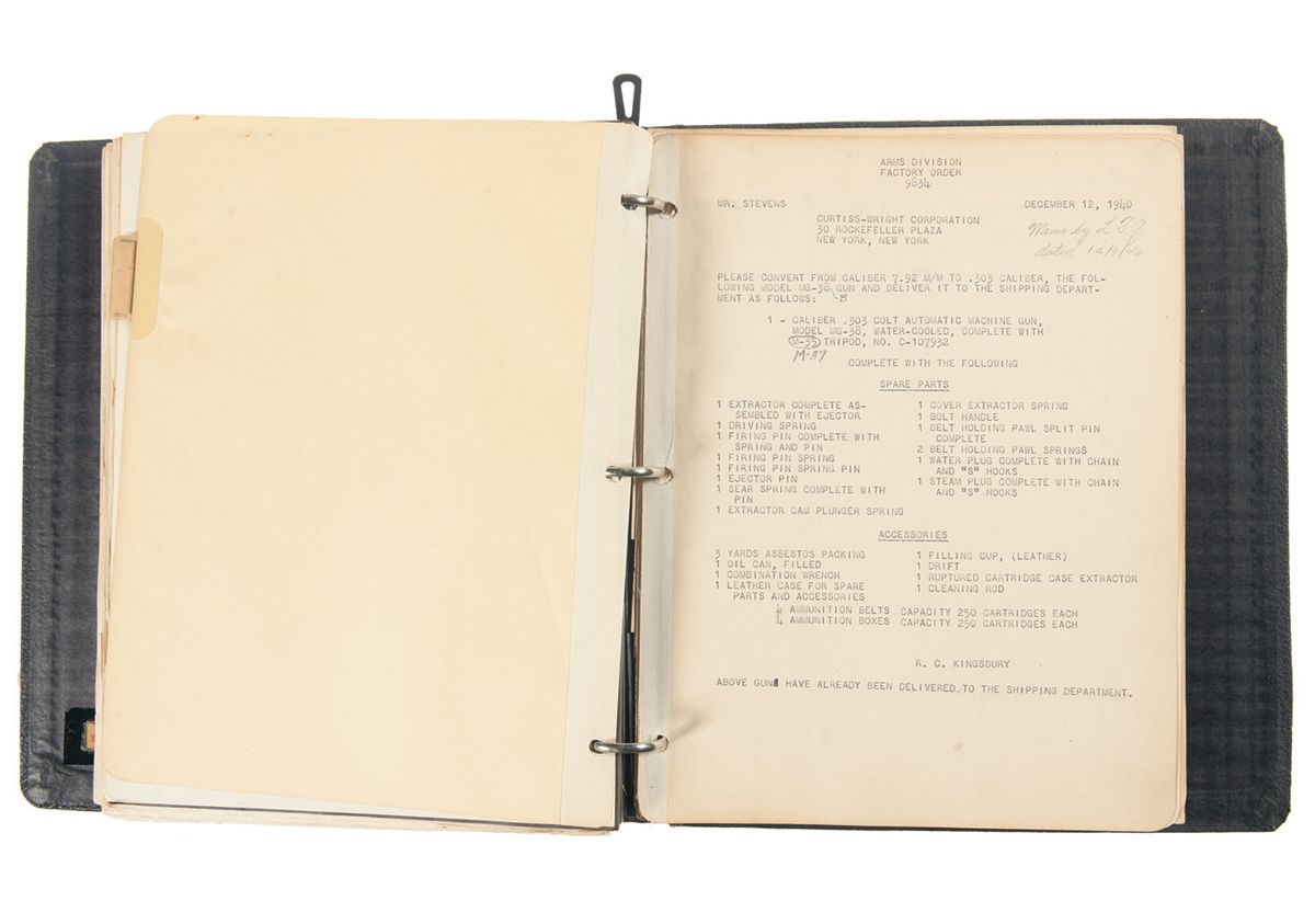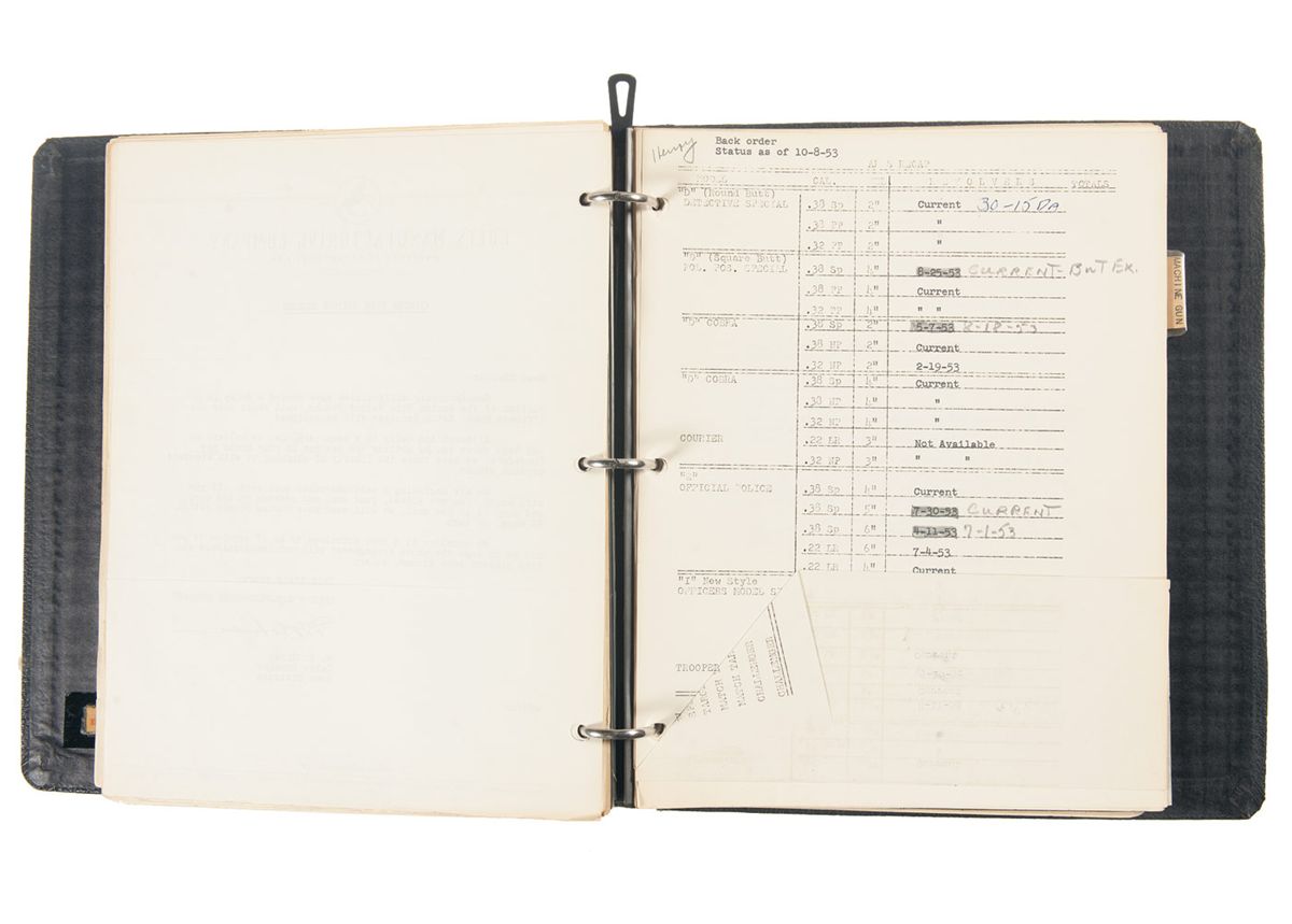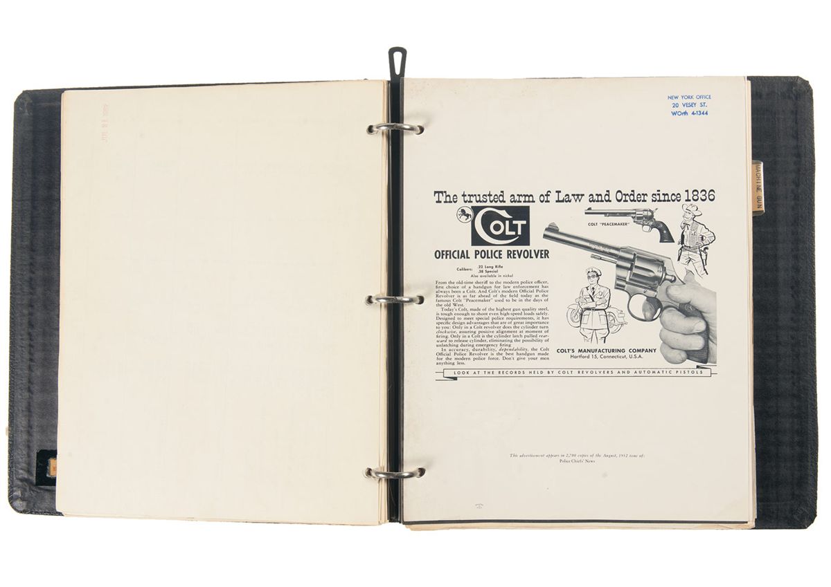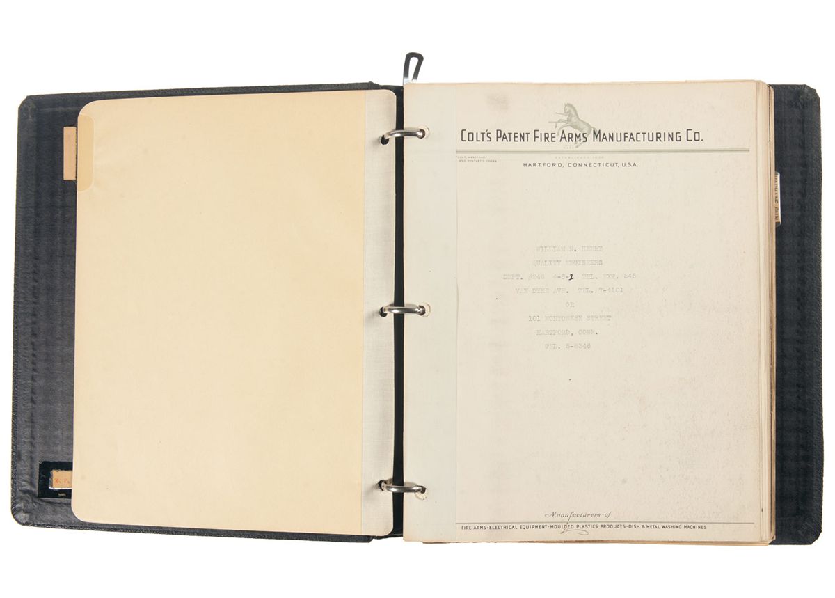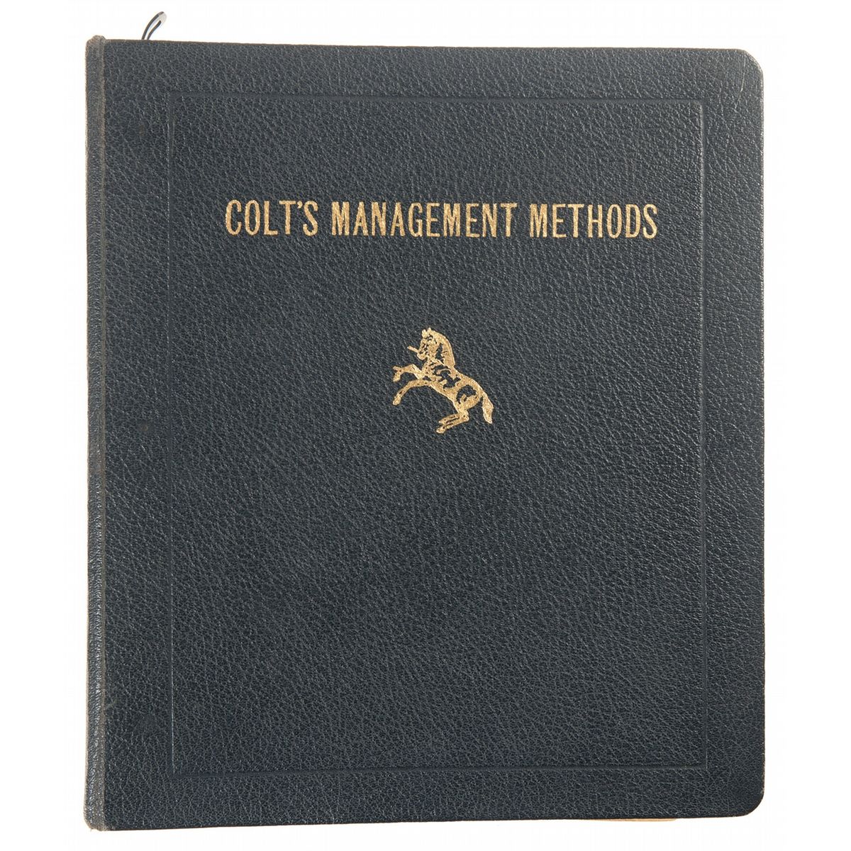 This black leatherette binder has "Colt's Management Methods" and the Rampant Colt logo gold embossed on the cover. It contains various paperwork from the factory. Very good.