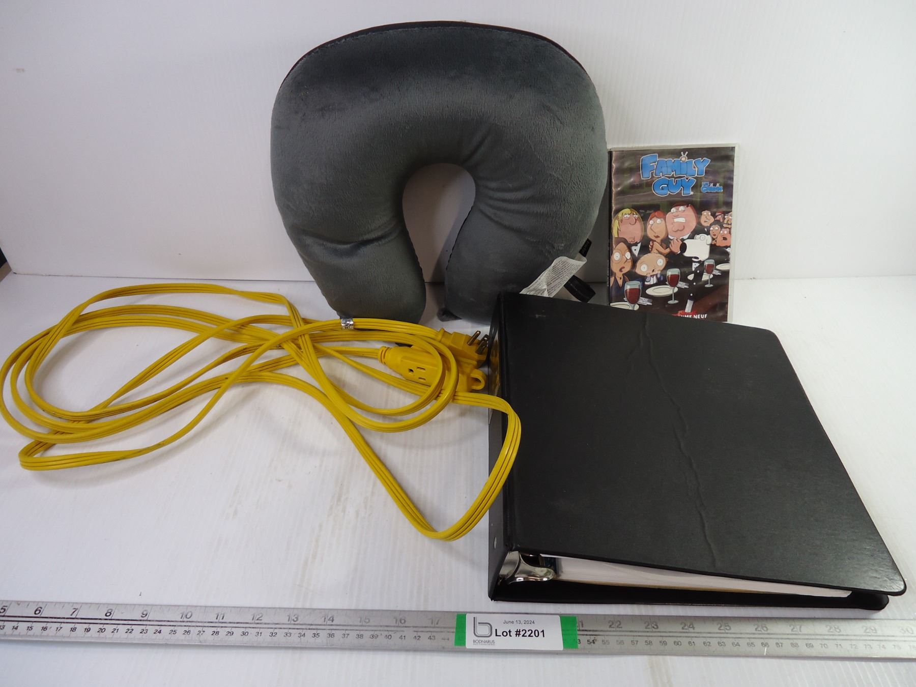 Binder of Paper, Extension Cord, Travel Pillow and Family Guy DVD Vol. 9