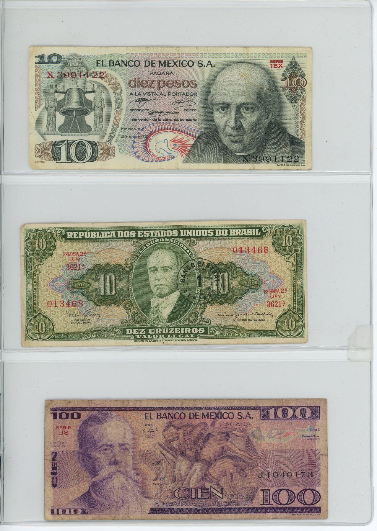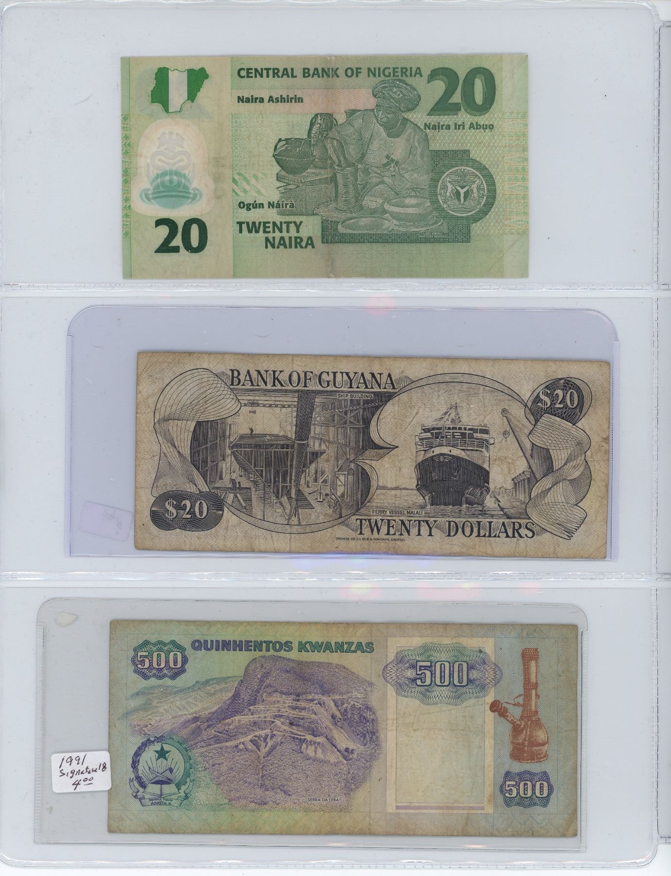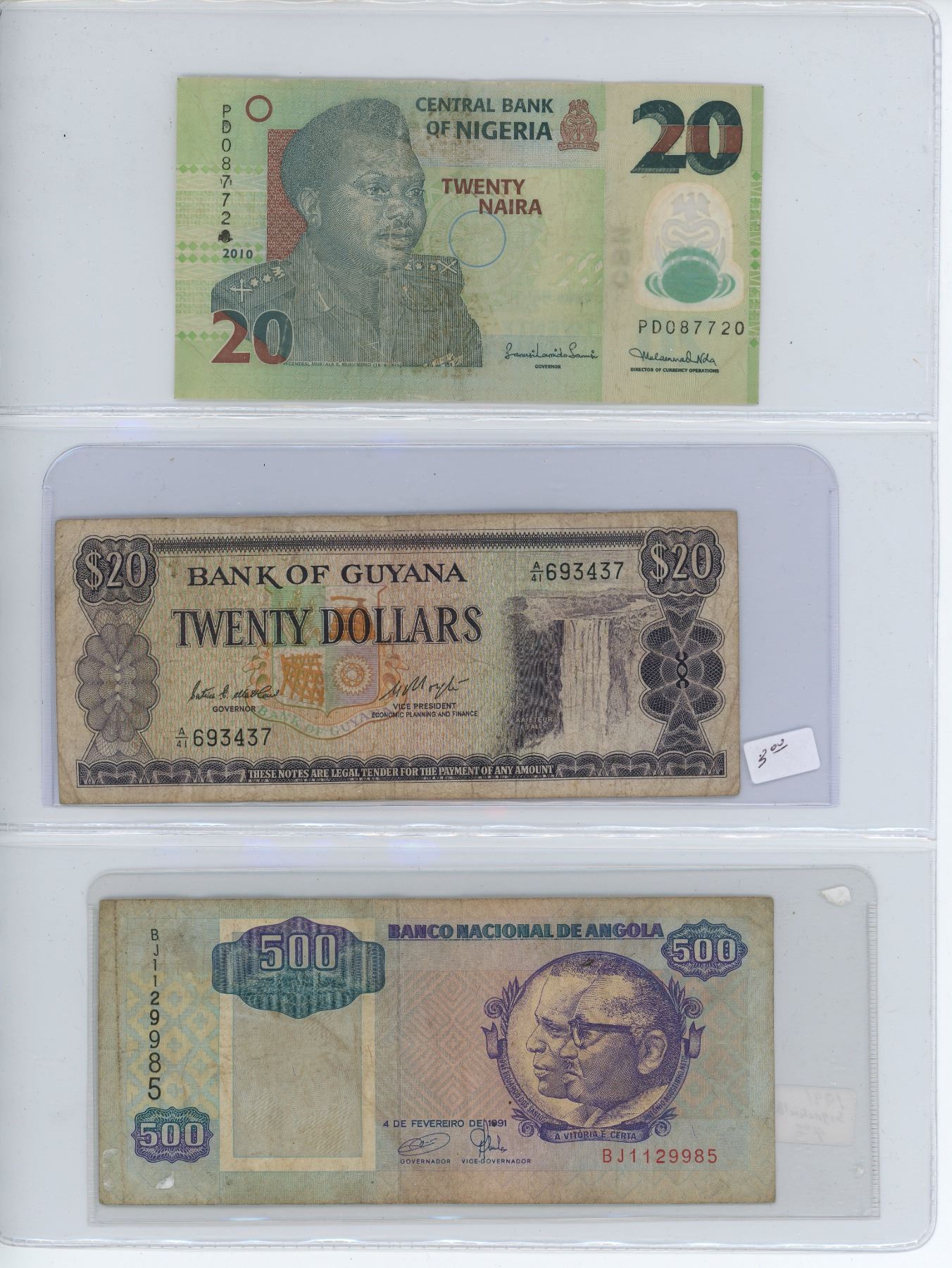 Binder of World Notes: 35 bills (approx. 16 countries incl. Guyana, Angola, Bahrain, Egypt, Nigeria