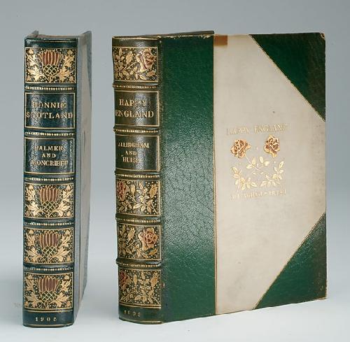 HAPPY ENGLAND [sold with] BONNIE SCOTLAND. xi, [1], 204 p.; xi, [1], 255 p.. Numerous illustrations. 8vo, half leather with vellum, spines with raised bands and gilt decoration of roses and thistles respectively, some dark staining to covers, teg, marbled endpapers, internally very good.