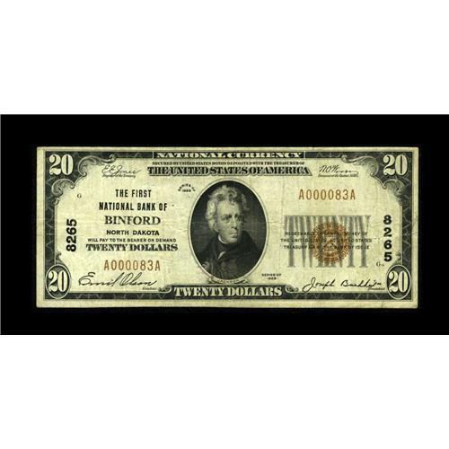 <B>Binford, ND</B></I> - $20 1929 Ty. 1 <B>The First NB</B></I> Ch. # 8265<BR>This <B>Fine+</B></I> note is from just one of 83 sheets printed by this issuer, the only federally chartered bank located in this small community. <B>Fine+.</B></I><BR><BR><b>Shipping:</b> Coin/Currency (<a target="_blank" href="http://www.heritageauctions.com/common/shipping.php">view shipping information</a>)